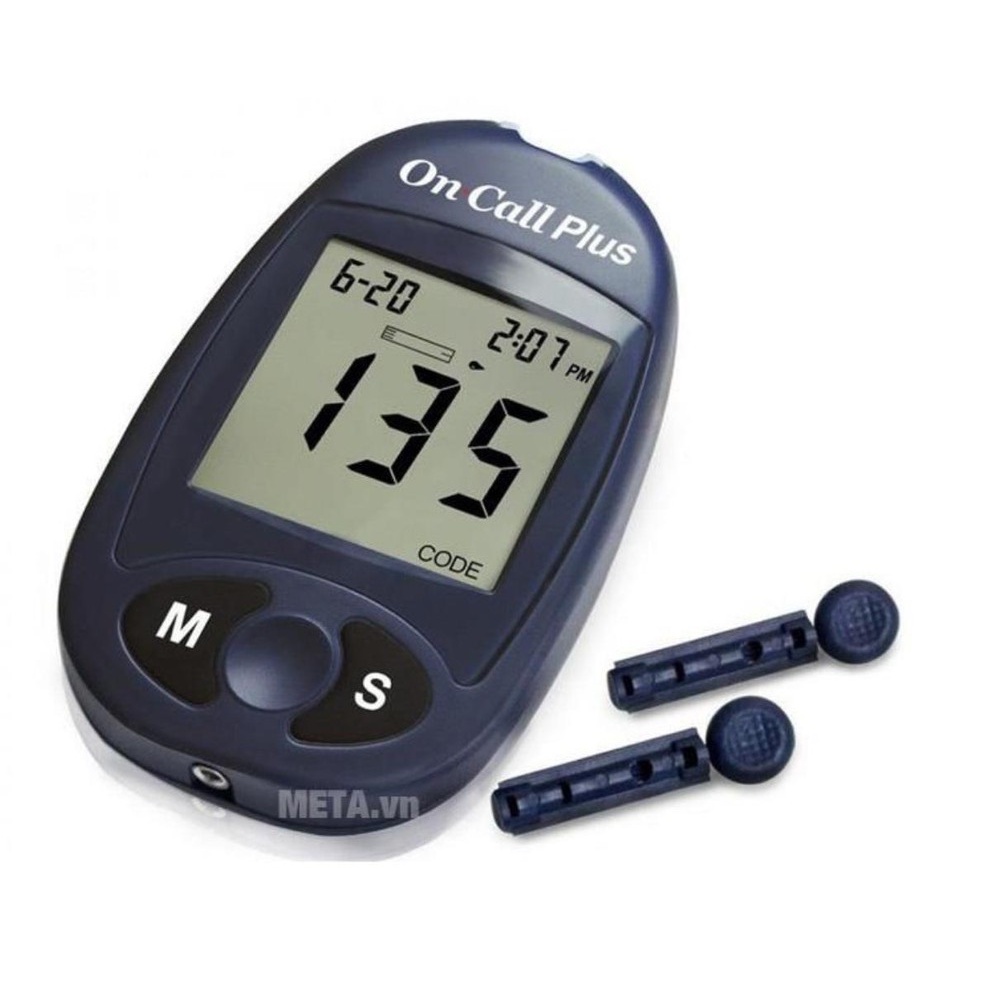 Máy on call plus, bút chích máu, 25 que thử + 25 kim lấy máu.