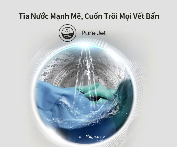 - Tia Nước Pure Jet: Hệ thống Pure Jet tạo ra tia nước mạnh mẽ, cuốn trôi hoàn toàn bột giặt và cặn bẩn trên cửa máy giặt, giúp quần áo sạch hơn.