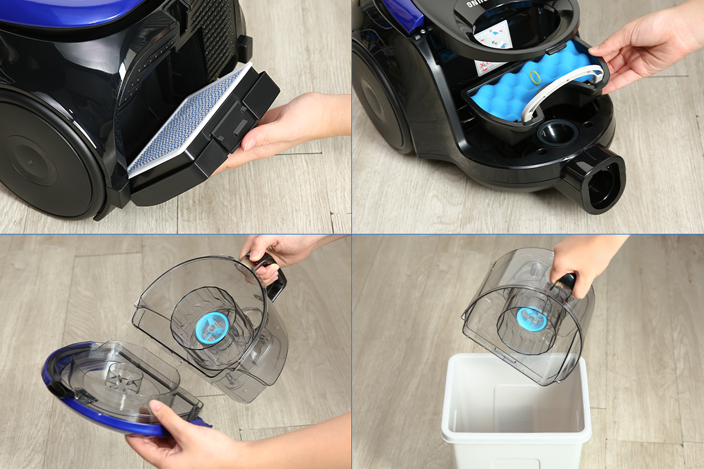 Công nghệ hút bụi lốc xoáy hiện đại không túi chứa bụi Đặc biệt thiết thực nhờ thiết kế nhỏ gọn Dễ dàng đổ sạch hộp chứa bụi chỉ bằng một nút nhấn Xử lý