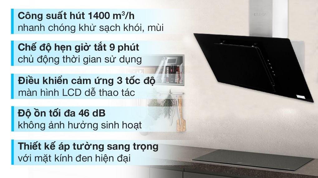 Kiểu máy treo độc lập Điều khiển: Cảm ứng 2 mặt 9 tốc độ siêu êm Khử mùi bằng than hoạt tính Lưới lọc inox dạng thanh 5 lớp Chất liệu: Inox - Kính Công