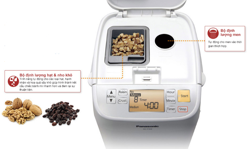 - Sau khi nghe tiếng bíp, lấy bánh mì ra. Định lượng nguyên liệu tự động Máy làm bánh mì Panasonic PALN-SD-P104WRA chính hãng tích hợp bộ định lượng men tự động ở thời điểm thích hợp, giống như một chiếc máy nướng chuyên nghiệp. Bộ định lượng hạt khô cắt nhỏ các phần trái cây khô, hạt và ngũ cốc, giúp các nguyên liệu được phân bổ đều trong ổ bánh. Bộ cảm biến nhiệt độ Chương trình làm bánh mì của dòng PALN-SD-P104WRA điều chỉnh chế độ theo nhiệt độ môi trường. Tổng thời gian nướng bánh của mỗi chương trình giống nhau, không tính điều khiện nhiệt độ. Chức năng hẹn giờ 13 tiếng Máy trang bị chức năng hẹn giờ lên đến 13 tiếng vô cùng tiện dụng, giúp bạn có thể đặt máy tự động tối đa 13 giờ để có thể làm bánh vào buổi tối và thưởng thức vào buổi sáng hoặc khi phải ra ngoài mà vẫn có bánh để dùng khi quay về nhà. 13 thực đơn phong phú Sản phẩm được trang bị sẵn 13 menu với những tùy chọn phong phú để bạn và gia đình có những bữa sáng vui vẻ, đầm ấm. Kiểm soát chất lượng vỏ bánh Ngoài ra, máy làm bánh mì Panasonic PALN-SD-P104WRA còn tích hợp tính năng điều chỉnh chọn màu vỏ bánh nhạt và vừa, đáp ứng sở thích khi dùng bữa. Chức năng ghi nhớ ghi mất điện Nếu mất điện trong quá trình làm bánh, máy sẽ tự động lưu lại bộ nhớ trong tối đa 10 phút và tiếp tục nướng khi có điện trở lại.