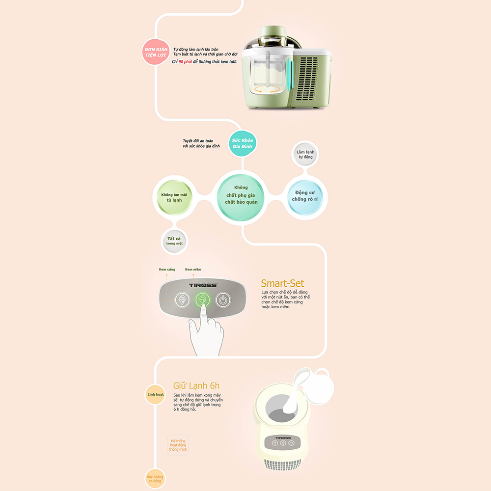 Ứng dụng công nghệ Ba Lan Máy làm kem tự động Tiross TS9090 có kiểu dáng nhỏ gọn, màu sắc đẹp mắt và sở hữu tính năng hiện đại, giúp bạn tự làm món kem thơm ngon, mát lạnh ngay tại nhà. Sản phẩm được thiết kế và ứng dụng công nghệ hiện đại của Ba Lan, mang lại sự tiện nghi cho mọi gia đình. Tiết kiệm thời gian Sản phẩm ứng dụng công nghệ hướng đến sự tiện nghi cho người dùng với 1 con chip thông minh có tên gọi Chip E-COOL. Chip E-COOL có khả năng làm lạnh siêu tốc, chỉ 90 phút cho một lần làm kem và thời gian giữ lạnh lâu gấp 2 lần máy làm kem thông thường giúp tiết kiệm điện năng cũng như thời gian chế biến. Hoạt động tự động và thông minh Máy làm kem tự động Tiross TS9090 chính hãng dễ dàng sử dụng chỉ với một thao tác. Bằng 1 nút ấn, máy sẽ tự động làm kem và tự động dừng khi hoàn tất quá trình làm kem rồi chuyển sang chế độ giữ lạnh trong 6 tiếng. Ngoài ra, để máy làm kem theo sở thích cá nhân, bạn có thể chọn chế độ kem cứng hoặc kem mềm. Với cách sử dụng đơn giản, bạn có thể trổ tài khéo léo, chế biến món kem mát lạnh ngày nóng cho cả nhà cùng thưởng thức. Chất liệu an toàn, thiết kế tiện dụng Máy được làm từ chất liệu nhựa tổng hợp và nhôm cao cấp có khả năng chịu lực, an toàn cho sức khỏe tuyệt đối. Ngoài ra, hệ thống làm lạnh tự động nhờ đó động cơ hạn chế sự rò rỉ, an toàn cho quá trình sử dụng. Sản phẩm có thiết kế tiện dụng, nắp bằng nhựa trong suốt có thể quan sát được quá trình làm kem, đồng thời nắp có lỗ cho phép bạn bỏ thêm nguyên liệu cả khi máy đang hoạt động. An toàn cho sức khỏe Sử dụng máy làm kem Tiross bạn không cần sử dụng đến tủ lạnh, nên không lo ngại kem ám mùi thức ăn, thực phẩm tươi sống. Kem tự chế biến tại nhà bằng trái cây không chứa chất phụ gia, chất bảo quản như các loại kem thông thường, tuyệt đối an toàn cho sức khỏe gia đình bạn. Hướng dẫn sử dụng