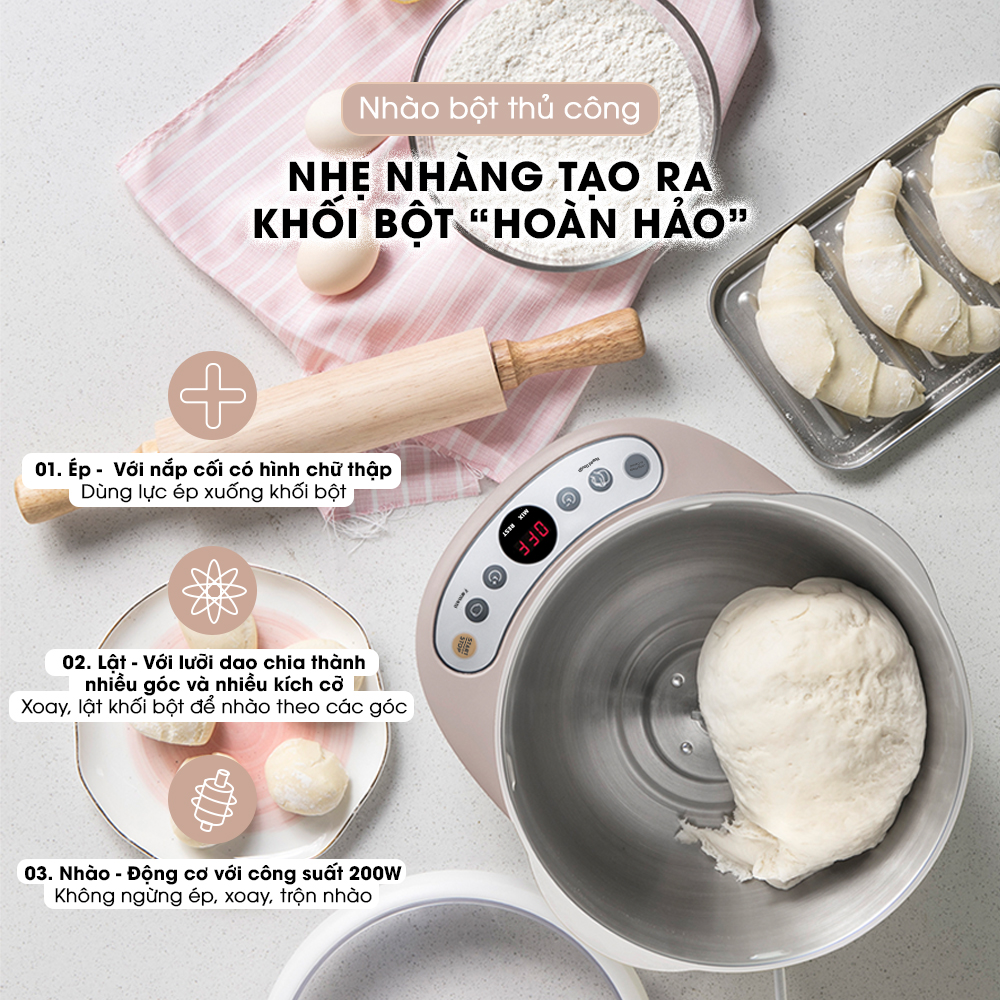 - trang bị 3 đầu trộn bằng thép không gỉ siêu bền, siêu an toàn cho phép người dùng có thể nhào bột làm bánh, đánh kem, đánh trứng, quết giò/chả, một cách mịn, nhuyễn nhất.