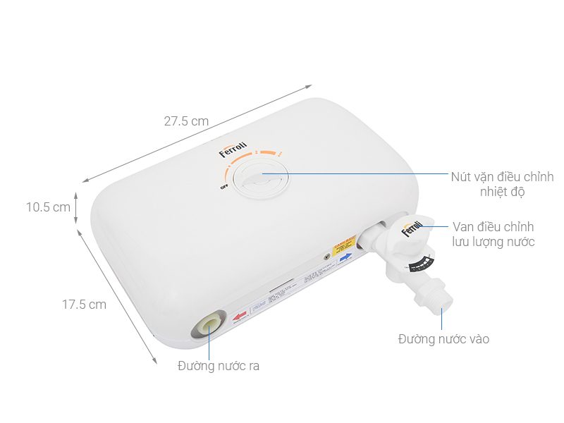 - Chịu áp lực nước tối đa 0.6 bar Máy Nước Nóng Ferroli Rita FS-4.5TE (4500W) có thiết kế màu trắng sang trọng cùng kích thước vô cùng nhỏ gọn, sẽ không chiếm nhiều diện tích không gian của bạn. Có thể dùng trong nhà bếp Đáp ứng nhu cầu sử dụng nguồn nước nóng đa dạng ngày nay, máy nước nóng Rita được thiết kế để bạn có thể dễ dàng kết nối với các thiết bị sen vòi, vòi rửa… trong phòng tắm lẫn nhà bếp. Bạn không những có thể sử dụng nước nóng để tắm mà còn có thể dùng để rửa bát, nấu nướng, lau dọn nhà bếp… An toàn tuyệt đối khi sử dụng Máy Nước Nóng Ferroli Rita FS-4.5TE sử dụng cơ chế làm nóng nước bằng dung môi nóng hiện đại, không phải thông qua thanh đun nhiệt bằng điện thông thường nên bạn có thể hoàn toàn yên tâm về hiện tượng rò rỉ điện trong quá trình sử dụng. Nhiều chế độ bảo vệ Ngoài chế độ làm nóng tách điện vô cùng an toàn, Ferroli Rita FS-4.5TE còn trang bị nhiều chức năng bảo vệ khác như: chế độ phát hiện lỗi trong lúc sử dụng, chế độ chống quá nhiệt, chống cháy khô khi lượng nước trong bình quá thấp, bộ lọc nâng cao chất lượng nước và kéo dài tuổi thọ cho thiết bị. Bộ chống rò điện ELCB Bất cứ khi nào có sự rò điện thông qua cơ thể người khi và các phần mang điện trong thiết bị, ELCB sẽ ngay lập tức ngắt kết nối với nguồn điện để đảm bảo an toàn cho người sử dụng. Thay đổi công suất linh hoạt Ferroli Rita FS-4.5TE cho phép bạn điều chỉnh 3 mức độ công suất sử dụng phù hợp tùy theo nhiệt độ môi trường bên ngoài, đảm bảo bạn luôn có dòng nước với nhiệt độ thích hợp để sử dụng mà vẫn tiết kiệm điện tối đa. DỄ DÀNG KẾT NỐI VỚI NHIỀU THIẾT BỊ SEN VÒI, VÒI RỬA Dễ dàng kết nối đồng thời với các thiết bị sen vòi, vòi rửa... phục vụ mọi nhu cầu nước nóng trong phòng bếp và phòng tắm VAN ĐIỀU CHỈNH LƯU LƯỢNG THUẬN TIỆN, CHẤT LƯỢNG Van điều chỉnh lưu lượng đặc biệt, dễ dàng điều chỉnh lưu lượng nước như ý muốn. Có độ bền cao.