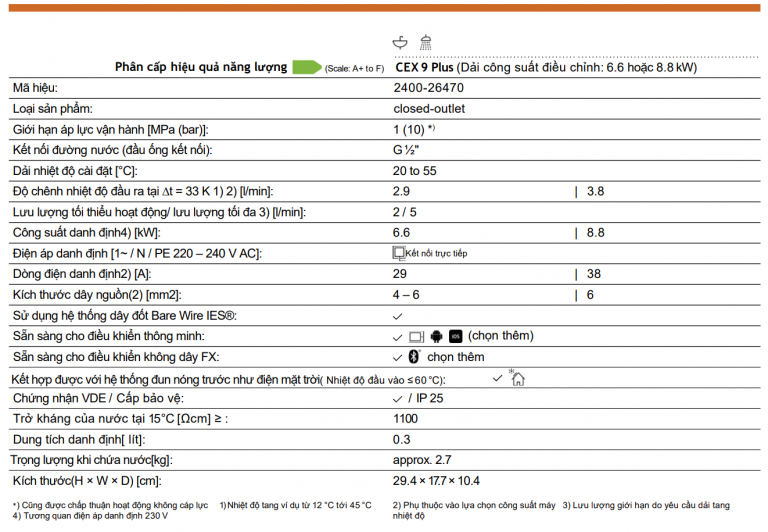 Sản phẩm cơ siêu bền và không bị ảnh hưởng độ ẩm cao trong nhà tắm. Được trang bị chống giật RCD an toàn tuyệt đối: được chứng nhận bởi TUV Rheinland và CQC Bầu