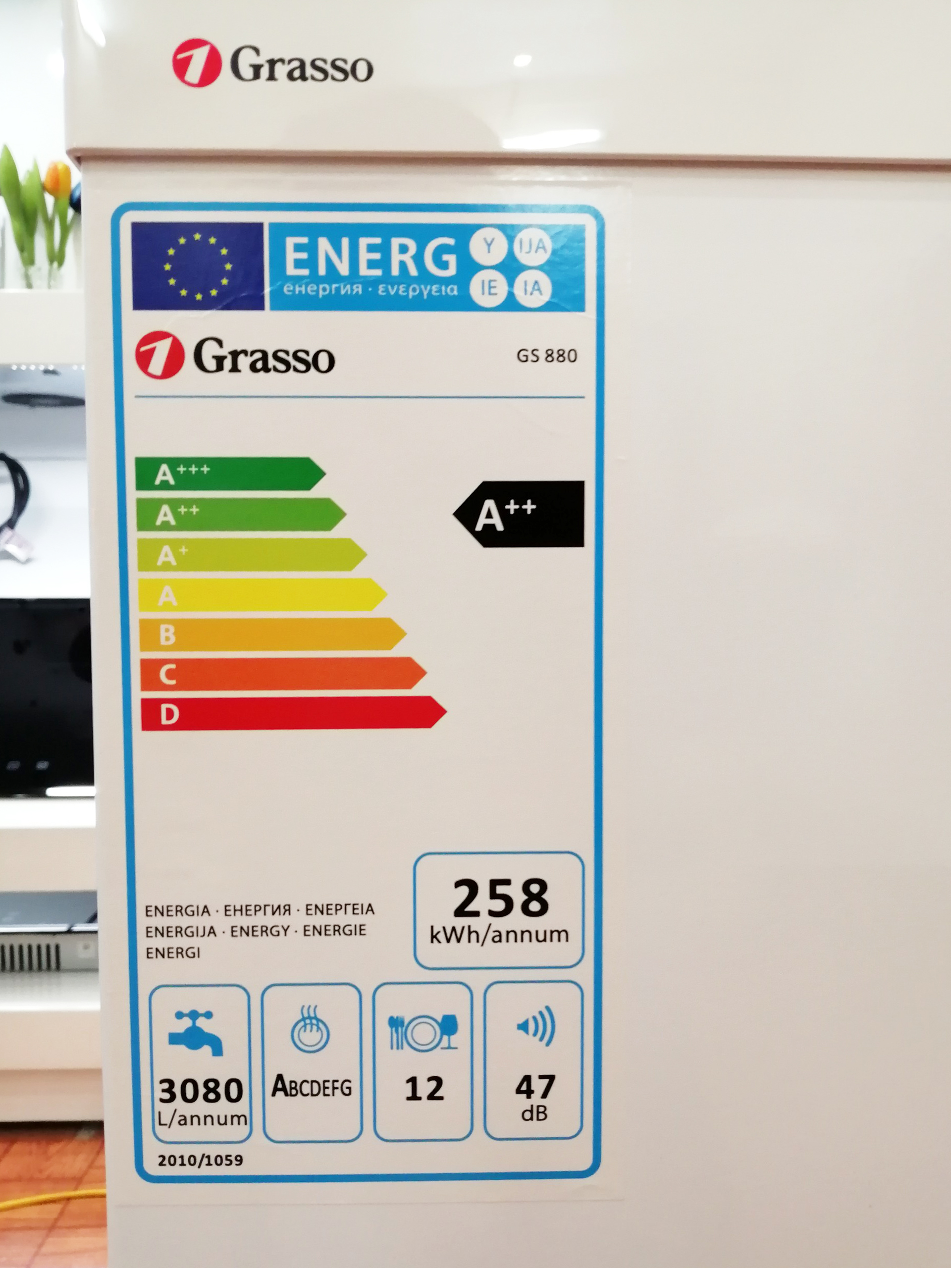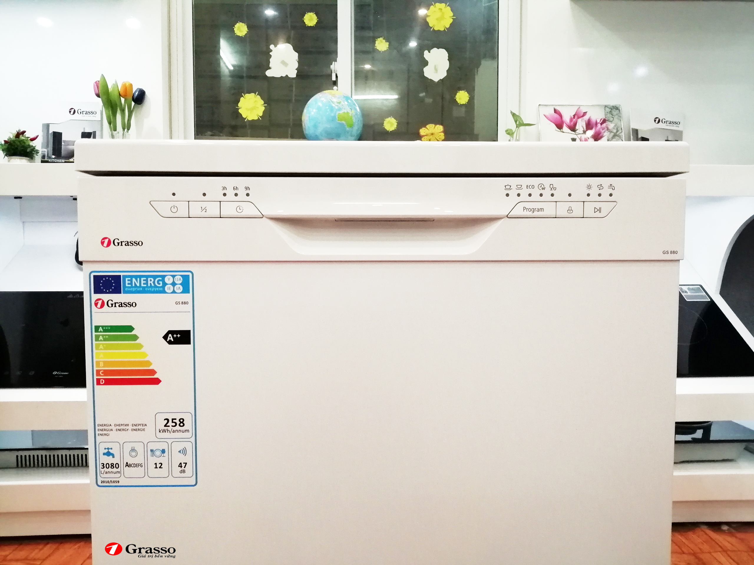 - Ưu điểm nổi bật của máy rửa bát Grasso GS 880 Máy rửa bát GS 880 được thiết kế lắp đặt âm tủ, tuy nhiên nó hoàn toàn có thể lắp đặt dương theo nhu cầu của khách hàng. GS 880 sử dụng chất liệu ngoài là inox cao cấp được sơn phủ lớp sơn trắng tĩnh điện bên ngoài vừa đảm bảo an toàn vừa tạo nên vẻ ngoài có khả năng phù hợp với những không gian nhà bếp hiện đại. Bên cạnh đó máy được trang bị bảng điều khiển phím nhấn có đèn báo giúp người dùng không chỉ có được một không gian nhà bếp hiện đại mà còn dễ dàng sử dụng, quan sát quá trình hoạt động qua đèn báo. Về thiết kế bên trong, máy rửa bát GS 880 được trang bị hai rửa và một giỏi đựng dao kéo, đồ nhỏ và đồ vật sắc nhọn khác. Trên các giàn rửa của máy rửa bát đã được thiết kế sẵn các móc gài và vị trí để xếp các đồ vật khác nhau như chén, lý, bát, đĩa nhỏ, đĩa lớn, nồi,…vì vậy bạn dễ dàng xếp đồ vật cần rửa của mình vào đúng vị trí và nhận được hiệu quả rửa tốt nhất. Về chức năng, máy rửa bát GS 880 được trang bị chức năng rửa: Chế độ ECO, rửa 90 min, rửa nhanh, rửa mạnh, rửa tráng, đặc biệt là rửa ½ giàn (trong trường hợp có ít chén bát sẽ rất tiết kiệm cho bạn). Với mỗi chu trình rửa, nó phù hợp với các nhu cầu khác nhau của người dùng, vì vậy tùy thuộc vào mức độ bẩn của đồ vật và số lượng đồ cần rửa hãy lựa chọn chu trình phù hợp với nhu cầu. Dung tích của GS 880 là 12 bộ chén dĩa theo tiêu chuẩn EU, với các tính năng rửa nước nóng, khóa trẻ em, hoạt động sấy khô hoàn toàn bằng hơi nước sẽ giúp cuộc sống của bạn trở nên dễ dàng hơn rất nhiều. Ngoài ra, máy rửa bát GS 880 tiết kiệm năng lượng triệt để và với mức năng lượng thụ ở mức A+ thân thiện với môi trường. Sử dụng máy rửa bát vừa tiết kiệm điện, nước, thời gian và công sức của bạn vừa đem lại một cuộc sống tiện nghi, an toàn đến mức bạn phải ngạc nhiên đó.