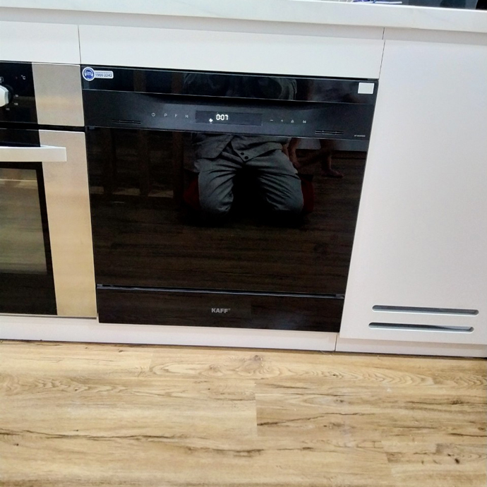 MÁY RỬA BÁT KAFF KF-BISW800 | LẮP ÂM TỦ HOẶC ĐỘC LẬP | 8 BỘ | MÀU ĐEN | NHẬP KHẨU NGUYÊN CHIẾC TỪ CHLB ĐỨC | THIẾT KẾ SANG TRỌNG | HỆ ĐIỀU KHIỂN CẢM ỨNG LINH HOẠT | AN TOÀN, BỀN BỈ VÀ TIẾT KIỆM ĐIỆN NĂNG   MÁY RỬA CHÉN ÂM TỦ KAFF KF-BISW800   Từ khi ra mắt trên thị trường máy này đã nhanh chóng nhận được rất nhiều phản hồi tích cực. Liệu rằng đằng sau vẻ đẹp sang trọng vốn có đó, máy rửa bát Kaff KF-BISW800 có điểm gì ưu việt đáng để lựa chọn và tin dùng?   Hiện tại có rất nhiều thương hiệu máy rửa bát trên thị trường trong đó máy rửa bát Kaff KF-BISW800 được người dùng yêu thích và tin dùng nhiều nhất. Đây là loại máy rửa bát mini cho phép người dùng rửa tối đa 8 bộ bát đĩa Châu Âu. Loại máy này do thương hiệu Kaff nhập khẩu và phân phối, sử dụng linh kiện chính hãng, đạt tiêu chuẩn năng lượng Châu Âu: A++, cho chất lượng máy vượt trội.   So với các loại máy rửa bát thông thường khác, loại máy rửa bát Kaff KF-BISW800 có nhiều ưu điểm vượt trội hơn, cho phép rửa được cả xoong nồi chảo. Dòng máy này rất thích hợp cho các gia đình ít người, từ 2-4 thành viên hoặc hộ gia đình có nhu cầu sử dụng ít.   ĐẶC ĐIỂM NỔI BẬT   Tổng quan thiết kế Máy rửa bát Kaff KF-BISW800 có thiết kế hình chữ nhật dọc, có kích cỡ R595 x S480 x C595 mm. Nhìn bề ngoài, máy có hình dạng như một chiếc tủ lạnh mini, khá nhỏ gọn và tiện ích, dễ dàng di chuyển tới nhiều vị trí khác nhau trong căn bếp gia đình.   Máy rửa bát Kaff KF-BISW800 được thiết kế dạng âm tủ. Người dùng có thể linh hoạt đặt trên mặt bàn hoặc lắp âm tủ đều được. Tuy nhiên, nếu muốn lắp đặt âm thì cần phải đảm bảo diện tích khoang tủ lớn hơn kích thước của máy, để dễ dàng sử dụng và vệ sinh.   Máy rửa bát 8 bộ Kaff KF-BISW800 có nhiều điểm ấn tượng, độc đáo và mới lạ hơn so với nhiều loại máy rửa bát thông thường. Chất liệu của máy là thép không gỉ, bền chắc, toàn thể máy sử dụng tông màu đen bóng sạch, đẹp tạo cảm giác sang trọng, hiện đại.   Mặt trước Mặt trước của máy rửa bát Kaff KF-BISW800 có phần tay vịn, bên trong là khoảng trống hở để người dùng dễ dàng nắm được và kéo ra khi cần. Tay vịn được làm bằng chất liệu inox 304. Chi tiết hoàn thiện tỉ mỉ và được gắn chắc chắn trên mặt cánh của máy.   Phía dưới thanh tay vịn là bảng điều khiển của máy, chứa các phím bấm hiện đại, mỗi phím bấm đều có biểu tượng đi kèm và cụm từ tiếng anh tương ứng. Nếu người dùng chưa quen với việc sử dụng tiếng anh, khi mua máy rửa bát sẽ đi kèm sách hướng dẫn sử dụng để giới thiệu chi tiết các tính năng của máy.   Tên thương hiệu được hiển thị ở chính giữa phía dưới chân máy rửa bát. Dưới cùng là phần đáy của máy rửa bát Kaff KF-BISW800. Phần đáy được ngăn cách với phần thân mới bởi 1 đường khe hở khoảng 1-2cm.   Mặt đáy Máy rửa bát Kaff KF-BISW800 có mặt đáy không bằng phẳng hoàn toàn như nhiều loại máy khác. Mặt đáy của máy có 4 trụ, tiếp xúc trực tiếp với sàn đất, làm bệ đỡ chính cho trọng lượng của máy. 4 trụ ở 4 góc đều được làm từ chất liệu thép không gỉ nên khả năng chịu lực tốt, chịu nhiệt và tính thích ứng với môi trường cao, không lo về vấn đề han gỉ, ẩm mốc.   Mặt đằng sau Mặt đằng sau sẽ toàn bộ khung màu đen, chứa ống thoát nước dài 158cm và ống cấp nước dài 154cm. Ngoài ra còn hệ thống dây điện dài 149cm. Tất cả những vật dụng liên quan đến dây điện, ống dẫn nước được sắp xếp ở mặt sau để tiết kiệm diện tích và đảm bảo tính thẩm mỹ cho máy rửa bát Kaff Kaff KF-BISW800.   Thiết kế bên trong Máy rửa bát Kaff KF-BISW800 có 2 khay rửa di động hay còn gọi là 2 giàn rửa bát đĩa. Khay trên là khay tiếp xúc gần sát với phần trán lắp trên của máy. Khay trên chủ yếu rửa các loại bát đĩa nhỏ, cốc, ly, vật dụng nhỏ không tốn diện tích.   Khay dưới của máy có khoang chứa rộng hơn, cho phép rửa các loại nồi nấu, chảo, bát đĩa ác loại đĩa thìa, người dùng có thể cho vào vào giỏ màu xám ở trong khay rửa dưới hoặc xếp làm ngang, sao cho các không có bất cứ vật dụng nào cản trở vào 2 tay quay gạt nước của máy.   Ở phía trong bên của máy rửa bát Kaff KF-BISW800 có chứa ngăn chứa muối và ngăn chứa các chất rác trong quá trình rửa. Người dùng cần dùng loại muối chuyên dụng cho máy rửa bát. Mỗi lần đổ muối sẽ dùng được khoảng 1,5 tháng - 2 tháng. Khi hết lượng muối cần thiết, máy sẽ báo hiệu ở trên bảng điều khiển.   Bên cạnh đó, phần cánh cửa đậy cần biết về ngăn đựng chất làm bóng và ngăn đựng viên tẩy rửa. Chất làm bóng giúp cho bát đĩa được sáng và bóng hơn, trong khi đó viên tẩy rửa là chất liệu quan trọng để đánh sạch mọi vết bẩn.   CÁC TÍNH NĂNG VÀ CHƯƠNG TRÌNH RỬA CỦA MÁY   Máy rửa bát Kaff KF-BISW800 có công suất tiêu