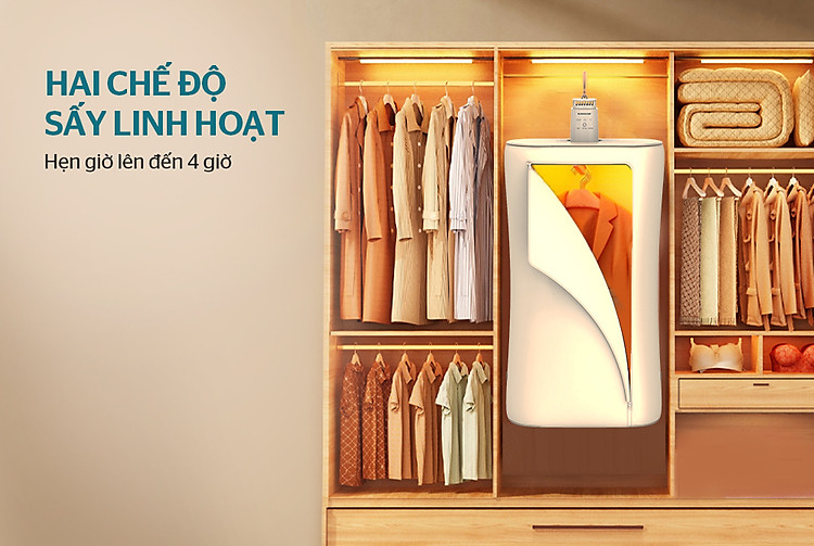 Sấy nhanh, Diệt khuẩn và mạt. Hai chế độ làm nóng PTC và gió nóng tuần hoàn 360° Thiết kế nhỏ, thuận lợi nhưng hiệu suất sấy cao. Có đèn UV để diệt khuẩn đạt