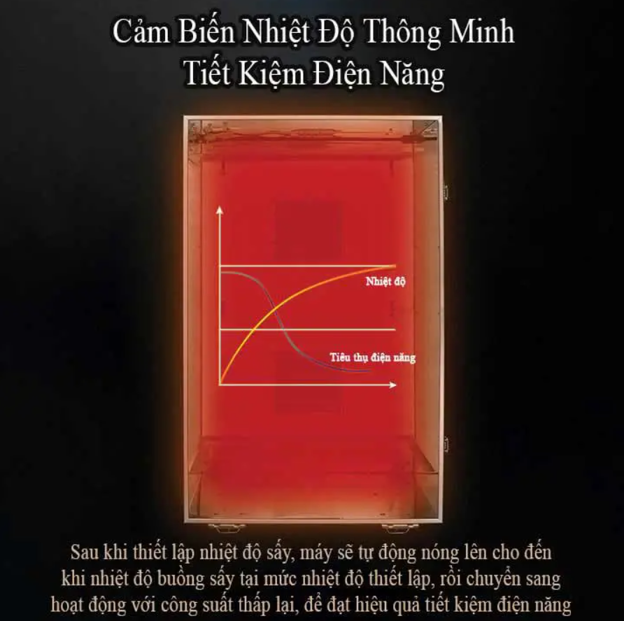 Đặc điểm máy sấy thực phẩm - Thùng sấy dung tích lớn lên tới 45L - Chế độ phân phối nhiệt theo phương ngang đồng đều - Có 12 khay lưới inox + 1 khay đặc hứng