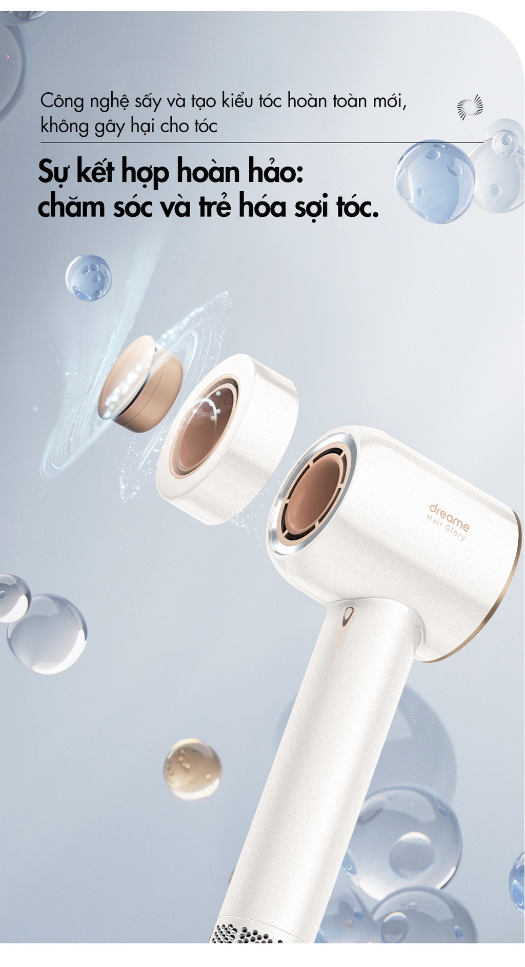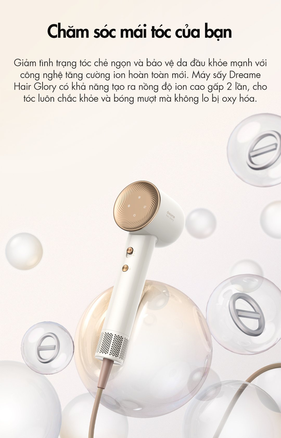 2 tốc độ, 4 chế độ sấy Chipset điều khiển nguồn điện để chống quá nhiệt, chống bỏng Làm khô tóc siêu nhanh, chỉ trong 2-3 phút Thiết kế sang trọng, kích thước gọn và trọng lượng nhẹ Thiết kế siêu gọn-nhẹ Định hướng là một sản phẩm chuyên phục vụ nhu cầu sấy và tạo kiểu cho cá nhân, Dreame tập trung phát triển mấy sấy tóc Dreame Glory với kích thước siêu gọn và trọng lượng nhẹ chỉ 345 gram. Không chỉ sở hữu thiết kế gọn gàng và trọng lượng nhẹ, Dreame Glory Standard còn được thiết kế để giúp người dùng cầm lâu sử dụng mà không bị mỏi tay hay khó chịu.  Sản phẩm ra mắt với 2 màu là Rose Gold và Cloud White đi kèm một phụ kiện tạo kiểu rời, được thiết kế để kết nối với thân máy bằng nam châm.   Các công nghệ trên Máy sấy tóc Dreame Nhằm mang đến một trải nghiệm sử dụng hoàn toàn mới cho khách hàng Việt Nam, Dreame Glory Hair Dryer được trang bị loạt công nghệ tiên tiến nhằm đảm bảo khả năng làm khô nhanh chóng cho tóc, vừa tránh để tóc bị cuốn vào trong, vừa an toàn về mặt điện năng. Ngoài ra, việc trang bị một chipset điều khiển nhiệt độ để tránh quá nhiệt, không gây bỏng da đầu và an toàn điện năng, chống giật. Phụ kiện sấy tóc kết nối với thân máy qua kết nối nam châm Chipset điều khiển nguồn điện để chống quá nhiệt, chống bỏng, duy trì nhiệt độ ổn định Làm khô tóc chỉ trong 2-3 phút (tóc nữ ngang vai)   4 mức nhiệt, 2 tốc độ thổi Dreame cho biết, để đám ứng nhu cầu sử dụng đa dạng của mỗi người dùng, hãng trang bị cho Máy sấy tóc Dreame Glory 4 cấp độ nhiệt đi kèm với 2 tốc độ thổi. Kết hợp với nhau, người dùng có tổng cộng 8 cách sử dụng khác nhau. Ngoải ra, người dùng còn có thể kết hợp với phụ kiện để chăm sóc tóc óc mượt và suôn mềm hơn. Dreame áp dụng kỹ thuật giảm tiếng ồn hiệu quả vốn đã có trên các sản phẩm Máy hút bụi của hãng, để giảm độ ồn và tạo sự thoải mái tối đa cho khách hàng.   Thông số kỹ thuật Tên sản phẩm: Máy sấy tóc Dreame Glory Nguồn điện: 220V~50Hz Công suất: 1600 Watt Kích thước sản phẩm: 72 x 82 x 255 mm Tốc độ động cơ: 110,000 vòng/phút Tốc độ thổi: 70m/giây Trọng lượng: 345 gram Chế độ nhiệt: 4 Chế độ gió: 2