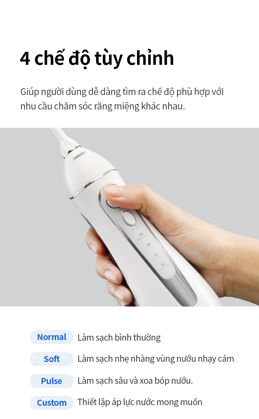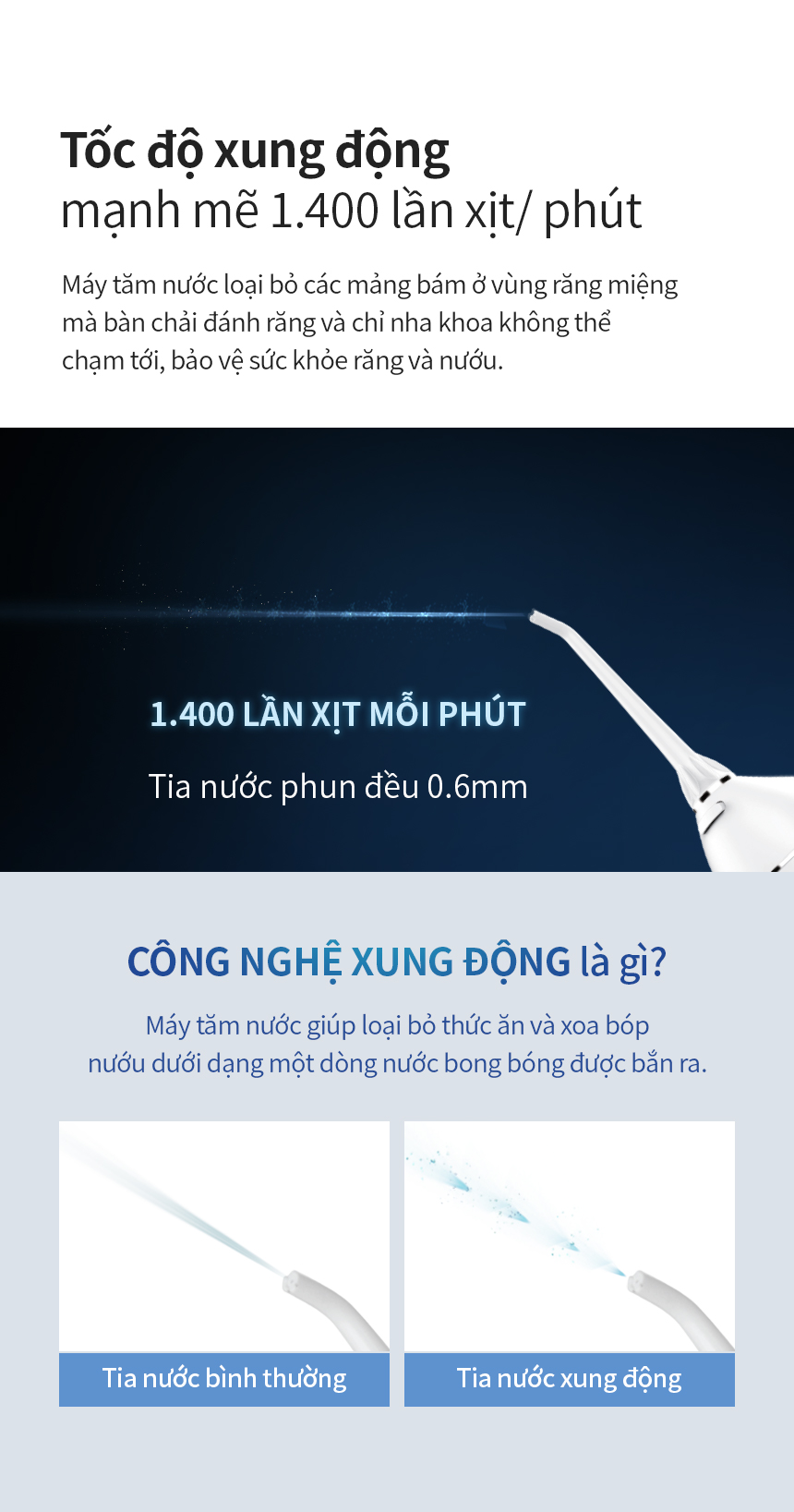 Máy tăm nước không dây LocknLock ENR166GRY - Hàng chính hãng, dung tích 300ml, 4 chế độ vệ sinh, pin xài 20 ngày - JoyMall  1. Thông tin sản phẩm:  Chất liệu: Nhựa ABS, nhựa PC Sản phẩm bao gồm: 1 máy, 3 đầu tăm, 1 đầu vệ sinh lưỡi Pin sạc lithium 1400mAh Bảo hành chính hãng 24 tháng Cân nặng: 380 gr Xuất xứ: Trung Quốc  2. Các loại đầu tăm và tính năng:  Đầu tăm tiêu chuẩn: dùng trong vệ sinh hàng ngày. (2 cái) Đầu tăm dành cho chỉnh nha: làm sạch xung quanh cầu răng, thích hợp cho người niềng răng (1 cái) Đầu vệ sinh lưỡi: loại bỏ vi khuẩn khỏi lưỡi một cách hiệu quả (1 cái) Đầu tăm của máy ENR166GRY tương thích với máy tăm nước ENR156BLU, ENR126WHT  3. Tính năng đặc biệt: - Máy tăm nước có dung lượng pin lớn:  Được tích hợp pin lithium 1400mAh, tăm nước có thể sử dụng lên đến 20 ngày. - Công nghệ hiện đại:  Bền bí với khả năng chống nước IPX7 Tự động tắt sau 2 phút Chức năng ghi nhớ chế độ - Dễ dàng sử dụng với nhiều chế độ tùy chỉnh:  Máy được trang bị 4 chế độ với 3 mức điều chỉnh áp suất cho mỗi chế độ. Người dùng có thể dễ dàng chọn cho mình chế độ phù hợp. - Nhiều loại đầu tăm chuyên dụng:  Với 3 loại đầu tăm chuyên dụng, máy phù hợp với tất cả nhu cầu và tình trạng rặng miệng của mỗi người. Đầu tăm có thể xoay 360 độ để có thể vệ sinh toàn diện khoang miệng.    - Thiết kế thon gọn:  Thiết kế không dây và thon gọn, tạo cảm giác thoải mái trong quá trình sử dụng. - Thiết kế bình chứa nước dung tích lớn 300ml có thể tháo rời:  Bạn có thể dễ dàng thêm nước và tiện lợi trong việc vệ sinh bình chứa, giúp ngăn ngừa vi khuẩn phát triển. Ngoài ra, bạn có thể dễ dàng quan sát mực nước bên trong. Thoải mái sử dụng, không lo bị gián đoạn. BẢO HÀNH CHÍNH HÃNG 24 THÁNG **Tips sử dụng: - Thay thế đầu tăm 6 tháng 1 lần để đạt hiệu quả vệ sinh răng miệng tốt nhất. - Xoay đầu tăm một chút để xả áp suất không khí bên trong ra ngoài, việc này sẽ giúp tháo đầu tăm ra dễ dàng hơn. Lưu ý: - Đọc kỹ hướng dẫn sử dụng trước khi dùng. - Không đặt hoặc bảo quản sản phẩm ở nơi có chứa nước hoặc có thể rơi xuống khu vực có nước. - Không sử dụng sản phẩm trong khi tắm. - Không nên đè mạnh đầu tăm vào răng hoặc lợi để tránh gây tổn thương. - Giữ sản phẩm, dây điện cách xa bề mặt nhiệt. - Nếu sản phẩm bị lỗi, vui lòng ngừng sử dụng. - Đầu tăm sẽ được tháo dễ dàng hơn sau một vài lần tháo lắp đầu tăm.   LƯU Ý KHI NHẬN HÀNG Để đảm bảo quyền lợi mua sắm cho quý khách, quý khách vui lòng quay video quá trình khui hàng / mở hàng. Đây sẽ là thông tin vô cùng quý báu để JoyMall có thể hỗ trợ tối đa trong trường hợp phát sinh trục trặc về đơn hàng