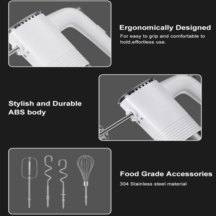 - Thiết kế Công thái học và Trọng lượng Nhẹ hơn: Máy trộn cầm tay này đã trải qua nhiều thử nghiệm an toàn và cố gắng cải thiện cảm giác thiết kế. Giảm tình trạng cầm nặng tay của những người đánh trứng thông thường khi bạn sử dụng. Giúp bạn sử dụng dễ dàng và hạnh phúc hơn.