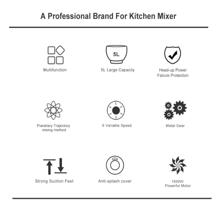• Chất liệu: thép không gỉ• Công suất 2400W• Thể tích 5,5L• Tích hợp 10 cường độ trộn• Đầu xoay mạnh mẽ• Nắp đậy chống bắn bẩn• Đầu đánh tạo kem• Đầu nhào bột• Thương hiệu