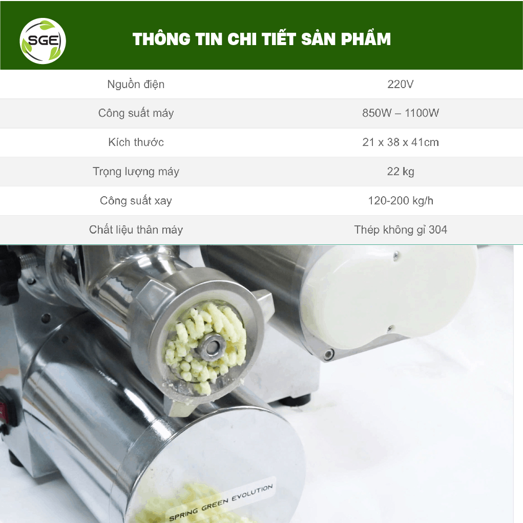 - Thành quả thu được sau khi xay MÁY XAY THỊT SGE TỐT NHƯ THẾ NÀO? – Có thể xay rất nhiều loại nguyên liệu khác nhau như thịt bò, thịt heo, cá, rau củ quả… – Công suất hoạt động tối đa của máy lên đến 180kg/h – Có thể sử dụng như máy xay ớt bột, rất tiện lợi – Có nhiều đầu cắt khác nhau giúp cho máy có thể dùng ở chế độ xay nhuyễn, thái miếng hay thái sợi tùy theo nhu cầu – Lưỡi dao sắc bén, bền bỉ, được thiết kế đặc biệt để xay nhuyễn, xay xương hoặc cũng có thể cắt sụn dễ dàng – Motor bằng đồng nguyên chất với công suất lên đến 1300w cực kì mạnh mẽ – Sử dụng đơn giản với nguồn điện dân dụng 220V – Chất liệu máy được làm từ inox 304, dày dặn, đảm bảo an toàn thực phẩm 100% – Tất cả các bộ phận chính của máy đều có thể tháo ra để vệ sinh dễ dàng – Sản phẩm được bảo hành chất lượng cùng với các dịch vụ hậu mãi chu đáo THÔNG SỐ KỸ THUẬT MÁY XAY THỊT MGA MÁY XAY THỊT 2 IN 1 MGA Nguồn điện 220V Công suất máy 850W – 1100W Kích thước 21 x 38 x 41cm Trọng lượng máy 22 kg Công suất xay 120-200 kg/h Chất liệu thân máy Thép không gỉ 304 HƯỚNG DẪN SỬ DỤNG MÁY XAY THỊT Máy xay thịt, xay ớt với các nguyên liệu sẽ được thử nghiệm hôm nay Thử nghiệm xay tỏi. Máy xay rất nhanh, kết quả đạt được rất ấn tượngThử nghiệm xay xả. Máy xay rất nhanh, kết quả đạt được rất ấn tượng Cả đống ớt thế này, chỉ nghĩ đến việc phải xay/giã bằng tay cũng đã mệt rồi Hành đã được xay nhuyễn. Cẩn thận đừng lấy tay dụi mắt trong khi làm nhé Thành quả của ngày hôm nay: ớt chưng vừa ngon vừa đẹp mắt MẸO: Sau khi xay thịt cá, rau củ hay gia vị xong xuôi, nếu muốn bảo quản đồ ăn được lâu hơn, công ty SGE khuyên dùng thêm giúp tăng thời gian sử dụng thực phẩm lên gấp 3 lần. CẤU TẠO VÀ CÁC BỘ PHẪN CHÍNH MÁY XAY MGA