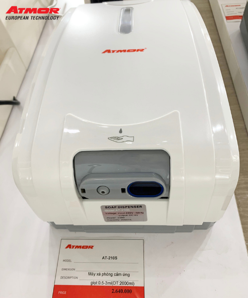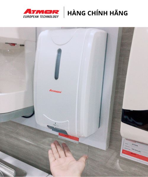 - Giới thiệu máy xịt cồn cảm ứng treo tường AT-007R (Dùng điện) Máy xịt cồn cảm ứng tự động (treo tường) ATMOR – AT-007R là dòng sản phẩm thiết bị cảm ứng chuyên dụng cho các khu công cộng như: Khu công nghiệp, bệnh viện, trung tâm y tế, công ty sản xuất thực phẩm, các văn phòng công ty, trung tâm mua sắm lớn,… Sản phẩm luôn mang lại sự an toàn nhất định với công nghệ cảm ứng không cần chạm tay vào máy để hạn chế lây nhiễm những bệnh truyền nhiễm. THÔNG SỐ CHI TIẾT CỦA MÁY XỊT CỒN CẢM ỨNG Hãng sản xuất ATMOR (Thái Lan) Tên sản phẩm Máy xịt cồn cảm ứng Kích thước AT-007R Nguồn điện AC 220V Dung tích 2000ml Hệ thống phun sương vừa đủ 0.5~6ml Chất liệu Nhựa ABS Màu sắc Màu trắng Bảo hành 12 tháng Vì sao nên chọn máy xịt cồn cảm ứng treo tường AT-007R (Dùng điện)?
