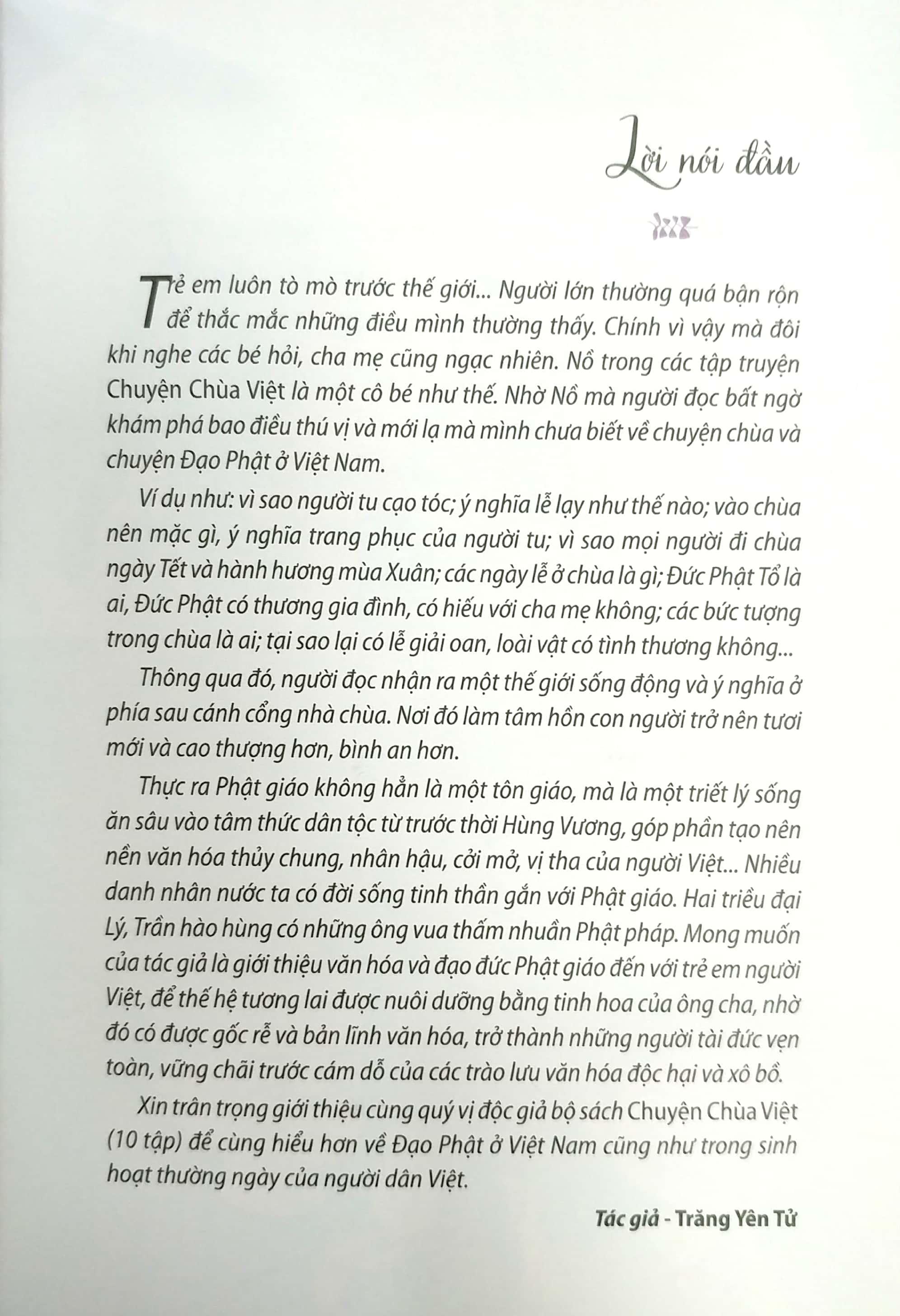 “Trẻ em luôn tò mò trước thế giới… Người lớn thường quá bận rộn để thắc mắc những điều mình thường thấy. Chính vì vậy mà đôi khi nghe các bé hỏi, cha mẹ cũng ngạc nhiên. Nồ trong các tập truyện Chuyện Chùa Việt là một cô bé như thế. Nhờ Nồ mà người đọc bất ngờ khám phá bao điều thú vị và mới lạ mà mình chưa từng biết.