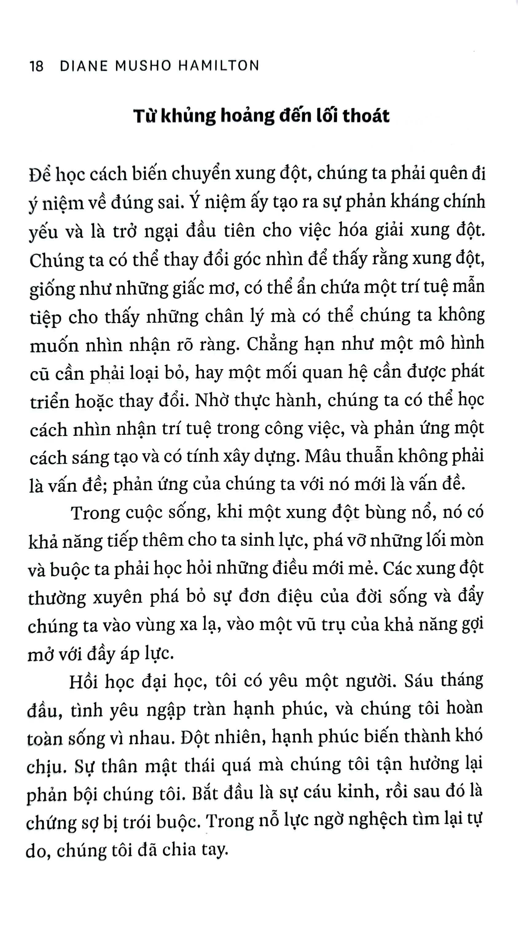 Cho dù những bất đồng, mâu thuẫn ấy có khó chịu đến đâu, đó vẫn là điều không thể tránh khỏi đối với trải nghiệm con người của chúng ta. Thay vì đối phó với nó trong tư thế đương đầu, ta sẽ học cách chung sống với nó và biến việc giải quyết xung đột thành một loại hình nghệ thuật, khiến ta trở nên kiên nhẫn hơn, sáng tạo hơn, chấp nhận những quan điểm đối lập, thấu hiểu mọi người xung quanh và chung sống hòa bình.