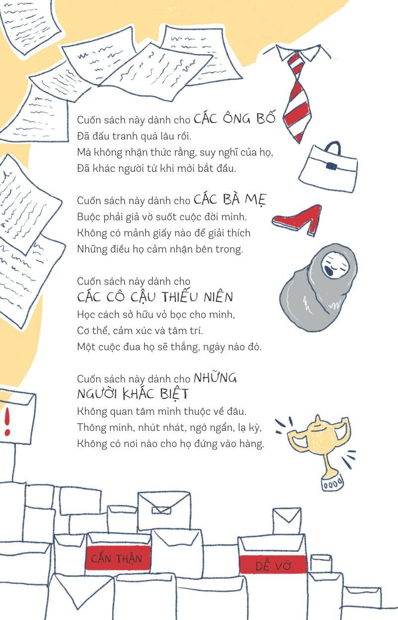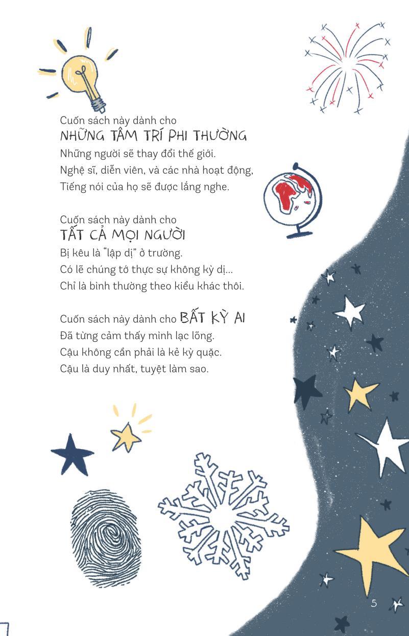 Một cuốn hồi ký có minh họa vui nhộn, truyền tải một cách hấp dẫn thông qua những bước nhảy cóc liên tiếp vui nhộn, những nét vẽ nguệch ngoạc sống động và những ghi chú đầy đủ thông tin. Thể hiện cảm giác khi lớn lên với chứng tự kỷ và không được chẩn đoán như một bài học bổ ích và mang tính giải trí cao -Guardian Tôi THỰC SỰ yêu thích cuốn này. Đây là cuốn sách mà tôi ước mình có khi còn nhỏ (tôi đã biết mình bị tự kỷ ngay lập tức, ngay lập tức khi đọc về những con mèo). Hãy mua nó cho con bạn, cha mẹ bạn, ông bà của bạn. Chủ yếu là mua nó cho chính mình - Holly Smale Cuốn sách này dành cho NHỮNG NGƯỜI KHÁC BIỆT Không quan tâm mình thuộc về đâu. Thông minh, nhút nhát, ngớ ngẩn, lạ kỳ, Không có nơi nào cho họ đứng vào hàng. Xin chào! Tên tớ là Abigail và tớ có TỰ KỶ. Dù vậy, mãi đến khi tớ thành người gần như là người lớn*, tớ mới biết mình mắc chứng tự kỷ. Đây là câu chuyện có thật về hành trình tớ lớn lên cùng những cảm giác khác biệt. Bên trong cuốn sách này, cậu sẽ khám phá đủ các kỷ niệm của tớ, từ gia đình, tình bạn, đến những que kem và toilet. Cậu cũng sẽ tìm thấy một số thông tin rất quan trọng về chứng tự kỷ. Và rất nhiều bức tranh tớ vẽ mèo, vì tớ rất thích mèo. Dù câu chuyện của cậu thế nào, chỉ cần nếu cậu đã từng cảm thấy lạc lõng như thể cậu không thuộc về nơi đâ THÌ CUỐN SÁCH NÀY LÀ DÀNH CHO CẬU. Cuốn sách hấp dẫn, chân thành, thú vị này thực sự sẽ khiến nhiều người cảm động và cảm thấy bớt cô đơn hơn trên thế giới này. Bằng chính trải nghiệm của mình kết hợp với kiến thức nghiêm túc tái hiện bằng hình thức truyện tranh vui nhộn, tác giả đưa bạn vào một cuộc hành trình dài, cuốn sách bao gồm rất nhiều chủ đề! Có rất nhiều yếu tố cho mỗi chương cùng với những hình minh họa bắt mắt, đáng yêu khiến độc giả hoàn toàn bị cuốn hút! Đây là một sự pha trộn đẹp đẽ giữa sự tổn thương, khó khăn, sự thấu hiểu, sự chấp nhận, sự vui nhộn và sự mạnh mẽ khiến người đọc không thể không lắng lòng. Một câu chuyện hoàn toàn có thật về sự độc đáo - được kể theo một định dạng độc đáo tuyệt vời. Mọi người chắc chắn đều có thể học được điều gì đó từ cuốn sách này; phần đã giúp một người đọc bình thường như tôi nhiều nhất là “hiểu và chấp nhận bản thân nhiều hơn một chút”! Đây là một niềm vui thực sự chân thực mà chúng tôi muốn giới thiệu cho tất cả mọi người, trẻ em cuối tiểu học, thanh niên và người trưởng thành, cả những người có tự kỷ lẫn không, cả những người có chút khác biệt với xung quanh. Tác giả: Abigail Balfe (Tác giả lời, Người vẽ tranh minh họa) Abigail là nhà văn, họa sĩ minh họa và nhà sản xuất sáng tạo tại Brighton. Kể chuyện luôn là trọng tâm trong sự nghiệp của Abigail và cô đã dành một thập kỷ dẫn đầu các chiến dịch truyền thông xã hội cho một số khách hàng truyền hình & giải trí lớn nhất trên thế giới. Abigail cũng từng biểu diễn hài kịch độc lập và giành được một số danh hiệu nhỏ nhờ sự hài hước trên sân khấu của mình.