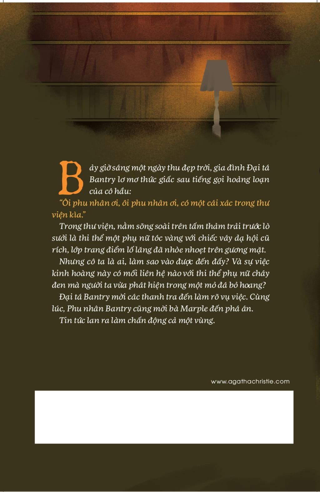 Bảy giờ sáng một ngày thu đẹp trời, gia đình Đại tá Bantry lơ mơ thức giấc sau tiếng gọi hoảng loạn của cô hầu. Một chuyện kinh hoàng đã xảy ra: Trong thư viện, nằm sõng soài trên tấm thảm trải trước lò sưởi là thi thể một phụ nữ tóc vàng. Đại tá Bantry một mực phủ nhận có quen biết với cô ta. Nhưng cô ta là ai, làm sao vào được đến đấy? Tin tức lan ra làm chấn động cả một vùng. Mọi nghi vấn đều đổ dồn về phía ngài Đại tá. Gia đình Đại tá lập tức mời các thanh tra đến làm rõ vụ việc. Cùng lúc, bà Marple cũng có mặt để tham gia phá án.
