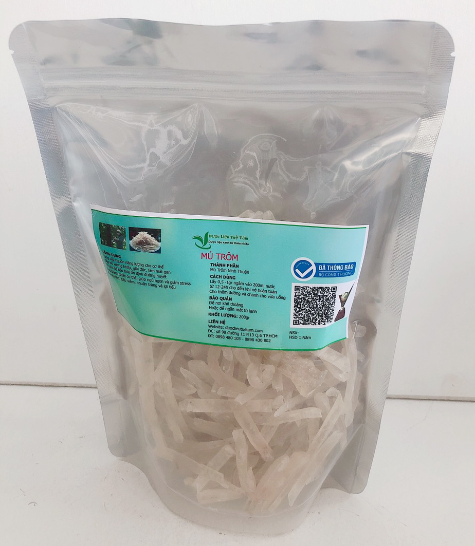 Ngâm 1-2 thanh mủ trôm nguyên chất (khoảng 10gr) trong 1.5 lít nước lọc (nhiệt độ thường) để trong ngăn mát tủ lạnh hoặc ở nhiệt độ phòng trong vòng 24 giở mủ trôm sẽ trương nở hết thành rạng sợi sệt hoặc dạng keo. Có thể đập nhỏ mủ trôm nguyên chất ra để quá trình trương nở của mủ trôm được nhanh hơn.