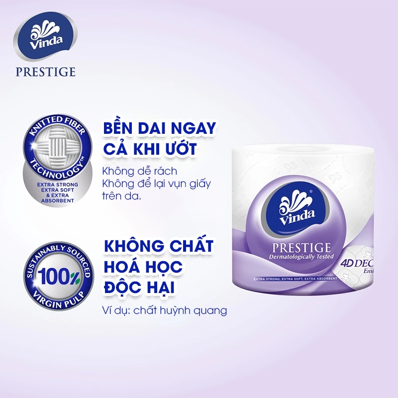 Câu chuyện thương hiệu: Các gia đình Việt Nam đang ngày càng quan tâm sâu sắc hơn về các giải pháp chất lượng và an toàn dành cho toàn bộ mọi người trong gia đình đặc biệt là trẻ nhỏ. Họ mong muốn sản phẩm không chỉ hiệu quả mà còn mang đến chất lượng thoải mái để họ có thể yên tâm về sức khỏe cũng như sự an toàn cho các thành viên trong gia đình. Vinda thấu hiểu sâu sắc và luôn nỗ lực để đáp ứng yêu cầu thích đáng của khách hàng.  Vinda mong muốn trở thành một phần không thể thiếu trong các hoạt động thường nhật của gia đình bạn. Khăn giấy Vinda sẽ mang đến sự hiệu quả cũng giống như sự bền dai vượt trội ngay cả khi ướt thông qua công nghệ Knitted Fiber chuyên biệt, qua đó, để các gia đình luôn cảm giác an tâm và thoải mái trong mọi khoảnh khắc. Giới thiệu sản phẩm: Giấy vệ sinh cao cấp Vinda Prestige 4D được sản xuất từ 100% bột giấy nguyên sinh, không hóa chất tẩy độc hại, an toàn cho cả làn da nhạy cảm. Giấy vệ sinh có kết cấu bền dai ngay cả khi ướt, không để lại vụn giấy khi sử dụng, giúp bạn luôn cảm thấy dễ chịu và sạch sẽ sau mỗi lần dùng. Sản phẩm có thiết kế với mỗi tờ dài hơn, tiết kiệm và cấu tạo 3 lớp, giấy vệ sinh Prestige đảm bảo khả năng thấm hút tốt, giúp giữ vệ sinh tối ưu Hạn sử dụng và quy cách: Hạn sử dụng: 3 năm kể từ ngày sản xuất. Ngày sản xuất: in trên gói theo năm/tháng/ngày Quy cách:  Giấy vệ sinh cao cấp Vinda Deluxe Số lượng: 8 cuộn/ lốc, 200 tờ/ cuộn Số lớp: 3 lớp/ tờ Định lượng của 1 lớp giấy: 18 ± 1,0 gsm Kích thước: (138mm x 105 mm) ± 5 mm Thành phần: 100% Bột giấy nguyên thủy. Bảo quản: Để nơi thoáng mát và tránh ánh nắng mặt trời