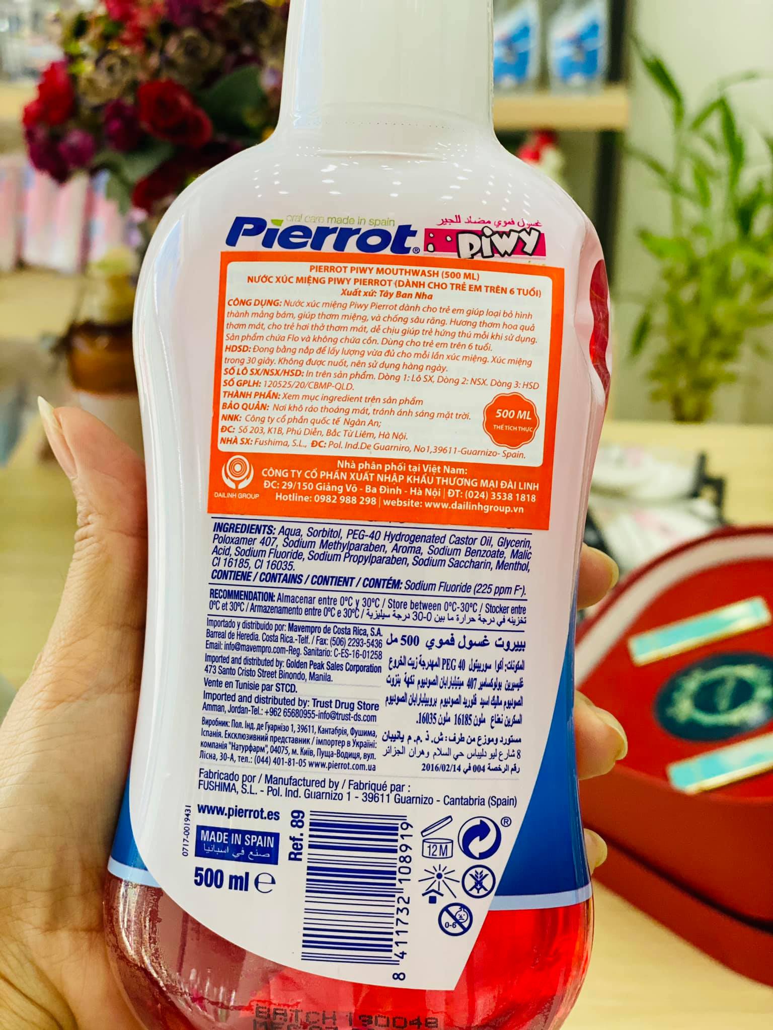 Nước súc miệng Pierrot là sản phẩm chăm sóc răng miệng với các tác dụng như sát khuẩn, sạch họng, làm sạch mảng bám, giúp hơi thở thơm mát, đặc biệt chống sâu răng. Pierrot với công thức đặc biệt dành riêng cho trẻ em. Hương dâu tây hấp dẫn tạo cho các bé cảm giác thích thú ngay sau khi súc miệng và đặc biệt không cay. Cách dùng: Ngậm khoảng 20ml, súc miệng thật kĩ trong 30 giây, không nên nuốt. Sử dụng 2 -4 lần sau khi đánh răng và sau bữa ăn. Bảo quản: Nơi khô ráo thoáng mát, tránh ánh nắng trực tiếp. Dung tích: 500ML Xuất xứ thương hiệu: Pierrot - Tây Ban Nha HSD: 5 năm kể từ nsx, nsx và hsd in trên sản phẩm Lưu ý: Sản phẩm dùng cho trẻ em từ 6 tuổi trở lên.