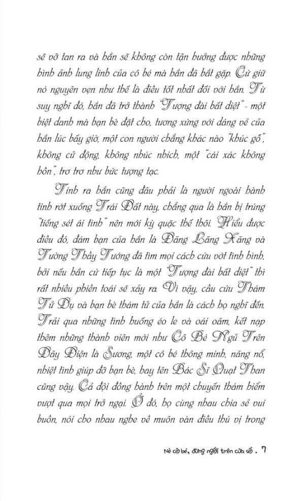 “Bạn có bao giờ nghe đến câu “Tình yêu sét đánh” chưa? Tôi chắc chắn là bạn đã được nghe ở đâu đó rồi, đúng không? Cũng hợp lý thôi vì chủ đề về tình yêu luôn được bàn tán rất nhiểu và ai rồi cũng sẽ trải qua ít nhất một lần trong đời. Đặc biệt, tình yêu ở lứa tuổi còn khoác chiếc áo trắng tinh khôi luôn là một chủ đề cuốn hút hơn cả. Bởi đó là tình yêu tuổi học trò mang dư vị của sự ngây ngô mới lớn, những rung động chớm nở đầu đời tinh khiết như những giọt sương sớm mai… Và hơn thế, rung động đó sẽ trở thành một phần ký ức không thể quên trong mỗi chúng ta. Tác phẩm Nè cô bé, đừng ngồi trên cửa sổ đêm đến một thế giới như thế.”