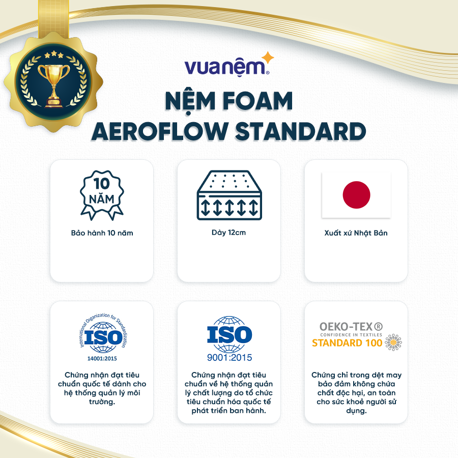 Nệm Foam Aeroflow Standard đáp ứng tiêu chuẩn khắt khe về chất lượng, đảm bảo tuyệt đối an toàn về sức khoẻ và phù hợp với tất cả mọi người.