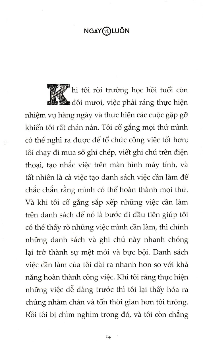 Ngay Và Luôn với cách viết và trình bày dễ đọc, cuốn cẩm nang nhỏ trên tay bạn sẽ cung cấp cho bạn: các chiến lược quản lý thời gian và các mẫu danh sách việc cần làm phổ biến nhất; kỹ thuật để vượt qua bệnh trì hoãn; cách thức để tăng cường sự tập trung, hiệu suất làm việc và sống ngăn nắp, quy củ hơn.