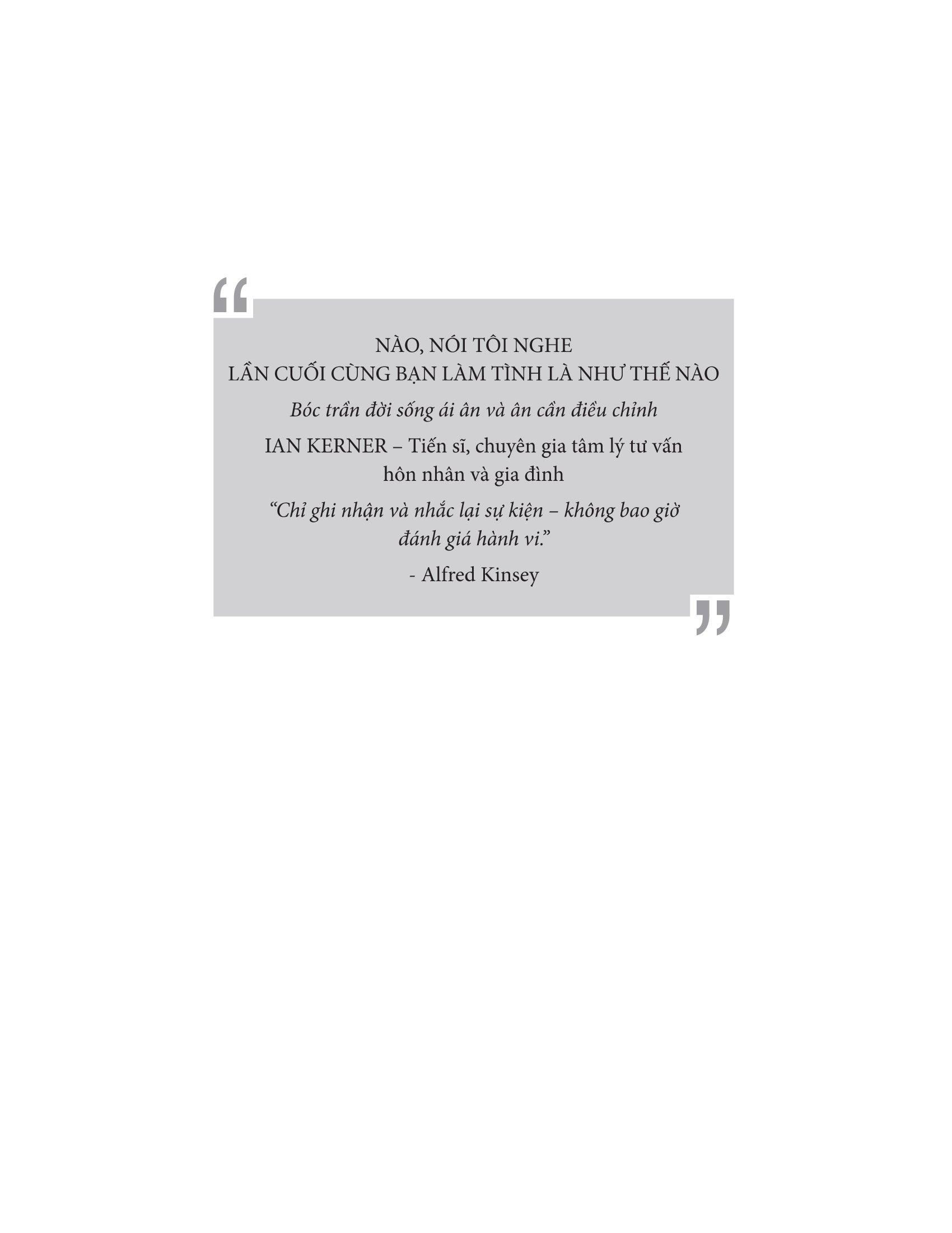 Nghệ Thuật Phòng The - Để Cuộc Yêu Thăng Hoa Nghệ Thuật Phòng The - Để Cuộc Yêu Thăng Hoa sẽ giúp bạn vượt qua những vấn đề và ức chế về tình dục, giúp bạn kết nối lại những chỗ “lệch pha”, những bất tương đồng và bế tắc với bạn tình để mở rộng thế giới quan về “chuyện ân ái”. Nhờ đó, bạn sẽ không cảm thấy chán mà thay vào đó là một đời sống tình dục phong phú và thăng hoa. Trong xuyên suốt cuốn sách này, bạn có thể khám phá tận hang cùng ngõ hẻm của vùng đất “mây mưa”, những đề tài gợi tình và những “bí kíp” tạo hưng phẩn chỉ bằng những điểm chạm. Bài tập thực hành tại nhà dưới dạng bài tự suy ngẫm, kích thích tâm sinh lý và rèn luyện hành vi sẽ giúp bạn nâng cao được phần năng khiếu; Thế nhưng còn phần đam mê, thực hành – Đó lại là tuỳ vào bạn! Cuốn sách gồm có 5 phần chính: Phần 1: Khúc dạo đầu Phần 2: Cao trào Phần 3: Cực khoái và dư ba Phần 4: 2…3…! Ta cùng bắt đầu Phần 5: Vướng mắc, gỡ rối và những bài thực hành hữu ích “Khám phá yếu tố cơ bản của bản thân không chỉ là chuyện về năng khiếu mà nó còn là đam mê: Là việc yêu những gì bạn làm.” Ở mỗi sự kiện giường chiếu nào cũng có một câu chuyện riêng. Đó có thể là ấn tượng về những chuyện đã xảy ra và những chuyện đã không xảy ra; Về những điều đã nói ra hay những điều không cất thành lời; Về khoái cảm đạt được và những khoái cảm chưa tới. Cuốn sách Nghệ Thuật Phòng The – Để Cuộc Yêu Thăng Hoa giúp các cặp đôi hoá giải bí mật về những muộn phiền chăn gối: Ít ham muốn, bất lực, lo âu, tự mình mâu thuẫn giữa ham muốn với đạo đức, khát khao thầm kín không san sẻ được với bạn tình (hay thậm chí cả với chính họ.). Nhờ đó bạn có thể nhìn vào đời sống ái ân của mình bằng thứ ánh sáng mới mẻ và soi chiếu nhiều khía cạnh đã bị khuất lấp trong bóng tối. Bất cứ khi nào mối quan hệ rạn vỡ, bạn hãy tin rằng thế nào cũng có cách hàn gắn nó, lý tưởng là càng nhanh càng tốt. Đôi khi phải mất 1, 2 hoặc 3 khoảnh khắc để bình tĩnh lại một chút và quay trở lại trạng thái bình lặng hơn. Mặc dù thế, nếu để quá lâu thì có thể tổn thất rất nhiều cho mối quan hệ. Thế nhưng muộn bao giờ cũng còn hơn không. Nếu như qua những kiến thức chăm sóc về tâm sinh lý từ Nghệ Thuật Phòng The – Để Cuộc Yêu Thăng Hoa bạn có thể thực sự tích hợp được tình yêu với tình dục và để cho hai phương diện này quấn quýt, tan chảy trong nhau. Vậy thì đây chính là một cái kết đẹp nhất cho cuốn sách này rồi!