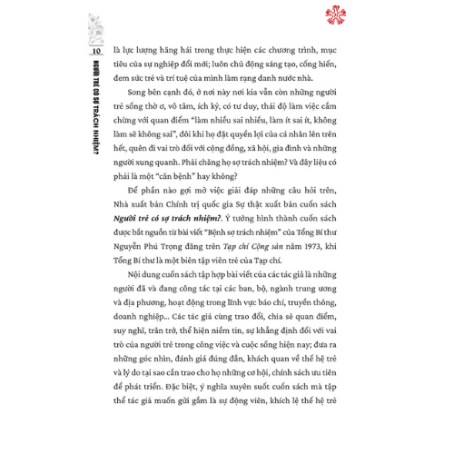 Các tác giả cùng trao đổi, chia sẻ quan điểm, suy nghĩ, trăn trở, thể hiện niềm tin, sự khẳng định đối với vai trò của người trẻ trong công việc và cuộc sống hiện nay; đưa ra những góc nhìn, đánh giá đúng đắn, khách quan về thế hệ trẻ và lý do tại sao cần trao cho họ những cơ hội, chính sách ưu tiên để phát triển. Đặc biệt, ý nghĩa xuyên suốt cuốn sách mà tập thể tác giả muốn gửi gắm là sự động viên, khích lệ thế hệ trẻ cần nuôi dưỡng, giữ gìn “vốn quý” của tuổi trẻ, không ngừng phát triển và sáng tạo ra nhiều giá trị hơn nữa nhằm bảo đảm một tương lai thành công, góp phần hoàn thành sứ mệnh lịch sử của mình. Trong đó, có một số bài tiêu biểu như: bài viết “Bệnh sợ trách nhiệm” của Tổng Bí thư Nguyễn Phú Trọng đăng trên Tạp chí Cộng sản năm 1973; “Vấn đề thanh niên trong tư tưởng Hồ Chí Minh” của GS.TS Tạ Ngọc Tấn, Phó Chủ tịch Thường trực Hội đồng Lý luận Trung ương; “Nâng cao hiệu quả công tác tư tưởng đối với thanh niên trong tình hình mới” của PGS.TS Lê Hải Bình, Ủy viên dự khuyết Trung ương Đảng, Phó Trưởng Ban Tuyên giáo Trung ương; “Trách nhiệm của đội ngũ công chức trẻ trong giai đoạn hiện nay” của PSG.TS Phạm Minh Tuấn, Phó Tổng biên tập phụ trách Tạp chí Cộng sản; "Học sinh, sinh viên, thanh niên dân tộc thiểu số rèn đức, luyện tài, phấn đấu vươn lên đóng góp vào sự phát triển của cộng đồng, dân tộc" của đồng chí Hầu A Lềnh, Ủy viên Trung ương Đảng, Bộ trưởng, Chủ nhiệm Ủy ban Dân tộc; “Làm thế nào để đội ngũ trí thức trẻ phát huy được trách nhiệm, hoàn thành tốt vai trò lịch sử của mình?” của GS.TS Phùng Hữu Phú.