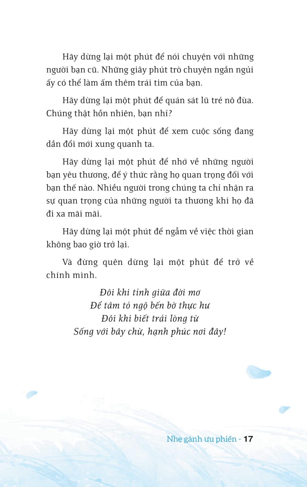 Nhẹ gánh ưu phiền là quyển sách thứ hai của tác giả Như Nhiên Thích Tánh Tuệ sau An nhiên giữa những thăng trầm. Với mong muốn tiếp tục góp thêm một đầu sách giúp quý độc giả vơi nhẹ gánh ưu phiền, tận hưởng niềm hạnh phúc, an lạc ngay trong từng hơi thở, tác giả tiếp tục tập hợp các bài văn, bài thơ vào cuốn sách thứ hai này nhằm truyền tải thông điệp chính: hạnh phúc không ở đâu xa xôi, hạnh phúc đang ở đây, ngay lúc này. Điều quan trọng là đôi mắt bạn có nhìn ra, trái tim bạn có cảm nhận được những niềm hạnh phúc ấy không. Đó cũng chính là giá trị và lợi ích thiết thực của sự tu tập trong Phật giáo. Tu không phải để ngày mai ngày kia sẽ hạnh phúc mà tu lúc nào là hạnh phúc ngay lúc đó.