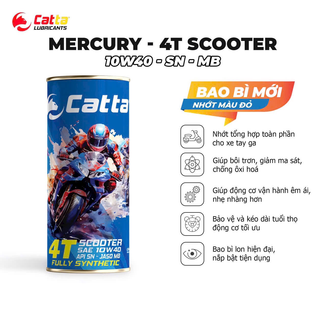 DẦU NHỚT TỔNG HỢP TOÀN PHẦN CHO XE TAY GA CATTA MERCURY – 4T SCOOTER SAE 10W40 – API SN – JASO MB – FULLY SYNTHETIC –  24/0.8L GIỚI THIỆU Dầu nhớt tổng hợp toàn phần cho xe tay ga 4T SCOOTER SAE 10W40, API SL, JASO MB, Fully Synthetic 24/0.8L là dầu bôi trơn động cơ dành cho xe ga 4 thì, được sản xuất từ nguồn nguyên liệu nhớt tổng hợp toàn phần fully synthetic. Dầu nhớt tổng hợp toàn phần CATTA MERCURY giúp làm giảm ma sát, động cơ vận hành êm hơn và nhẹ nhàng hơn. Công thức riêng biệt kết hợp giữa dầu gốc và những phụ gia chất lượng theo một tỷ lệ hoàn hảo giúp sản phẩm có tính năng bôi trơn vượt trội, đồng thời bảo vệ và kéo dài tuổi thọ động cơ tối ưu. Sản phẩm dầu nhớt Catta được sản xuất từ nguyên liệu nhập khẩu hoàn toàn trên dây chuyền công nghệ hiện đại, đội ngũ kỹ thuật tận tâm và nhà máy đạt chứng nhận ISO 9001:2018. Tiêu chuẩn quốc tế đáp ứng: