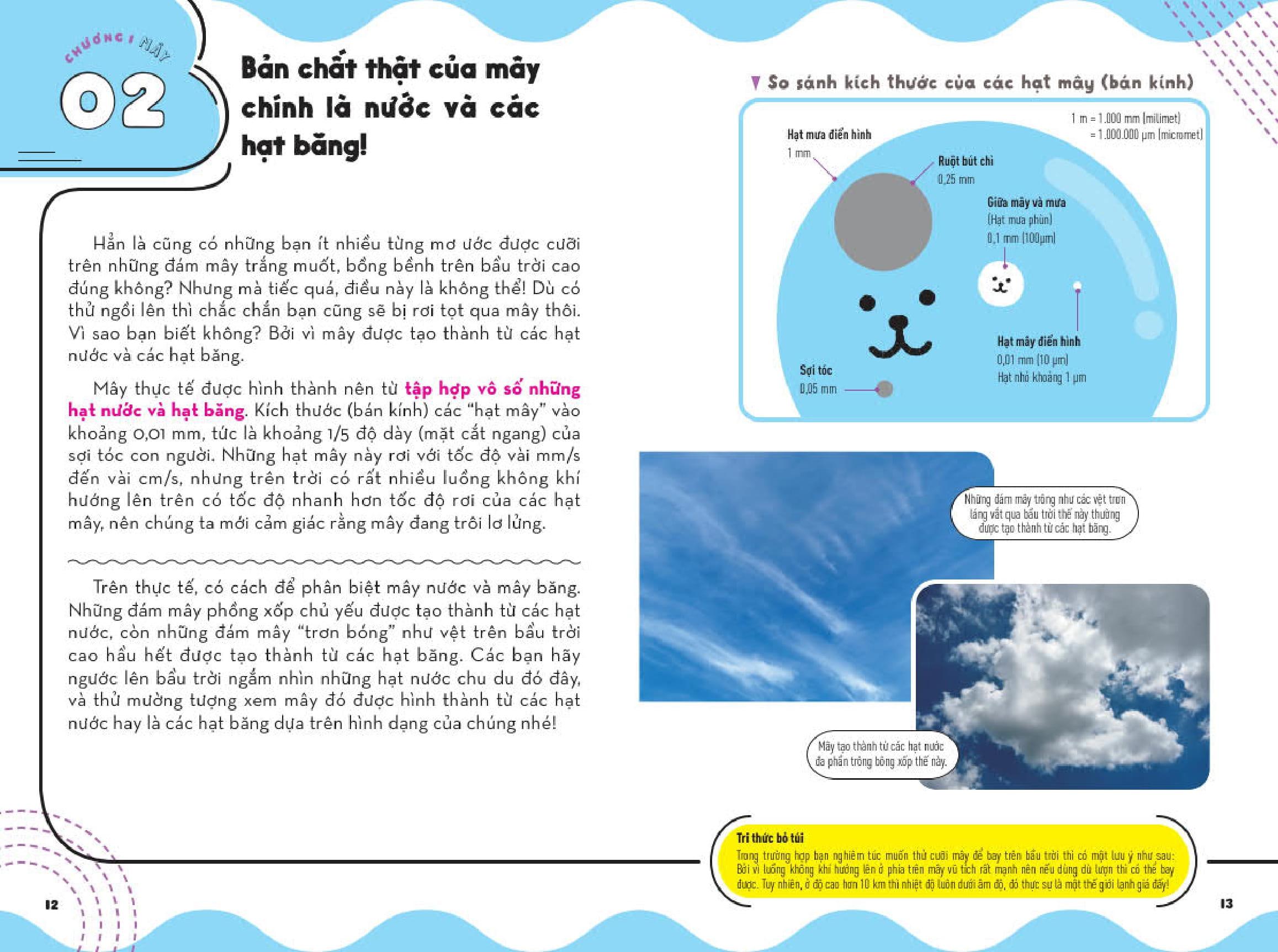 Những Kì Quan Thời Tiết - Từ Điển Bỏ Túi Về Các Hiện Tượng Thiên Nhiên Kì Thú - Tập 1 Mỗi khi ngước nhìn bầu trời, hẳn mỗi người trong chúng ta đều một lần nghĩ rằng: “Mình muốn leo lên những đám mây khổng lồ quá!”, hoặc “Không biết điểm cuối của cầu vồng ở đâu nhỉ?”. Bầu trời quá đỗi thân thuộc khi ngày ngày chúng ta vẫn ngắm nhìn nó và lắng nghe dự báo thời tiết trên tivi, thế nhưng vẫn còn rất nhiều điều về bầu trời mà chúng ta chẳng hay biết đến. Với cách diễn giải đơn giản, dễ hiểu cùng hình minh họa trực quan, sinh động, bộ sách Những Kì Quan Thời Tiết – Từ Điển Bỏ Túi Về Các Hiện Tượng Thiên Nhiên Kì Thú sẽ giải đáp nhiều thắc mắc của độc giả về bầu trời, các đám mây, các hiện tượng thời tiết vừa quen thuộc, vừa lạ kì. Bộ sách sẽ kéo gần khoảng cách giữa chúng ta với bầu trời và những đám mây, khiến bạn phải sửng sốt thốt lên: “A! Nguyên do của hiện tượng đó là thế!”