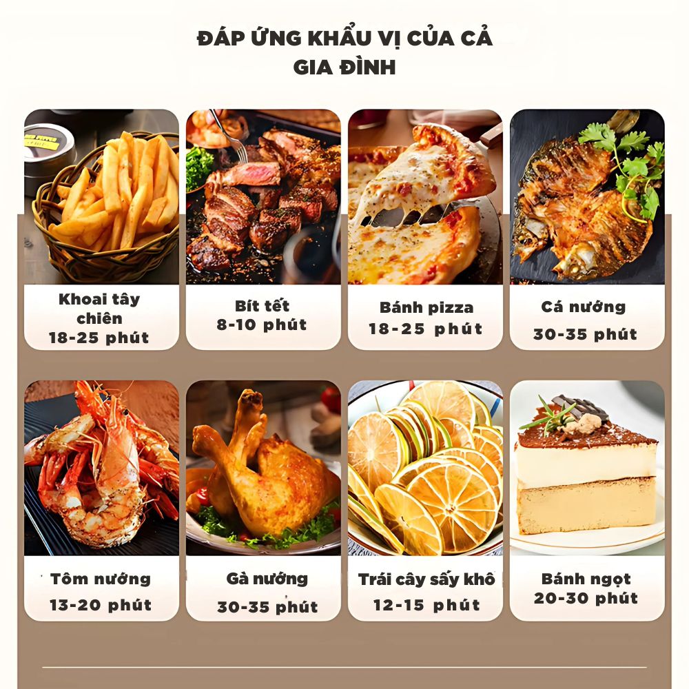 • Dung tích lớn 9L: Chiên nướng thoải mái cho gia đình và tiệc tùng.