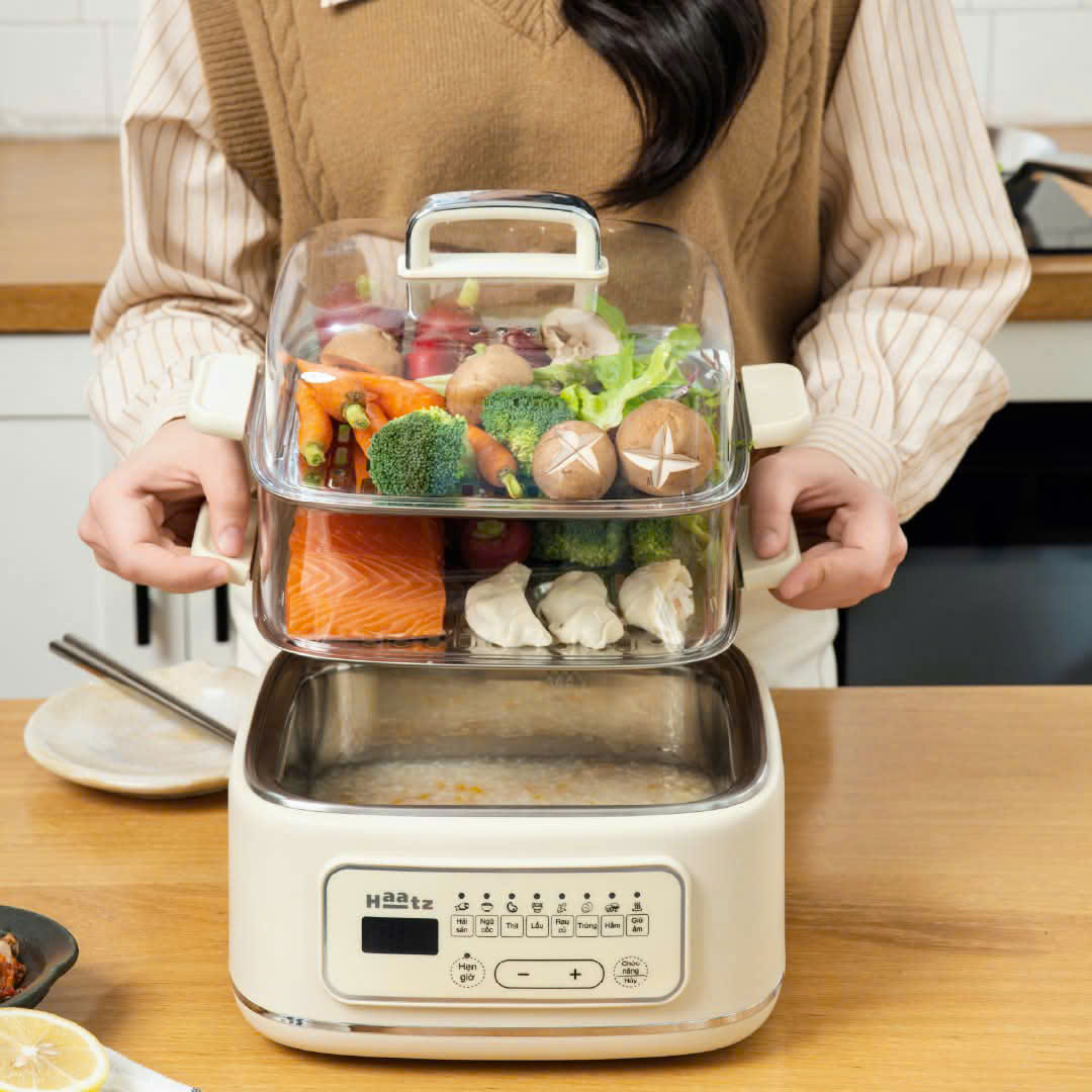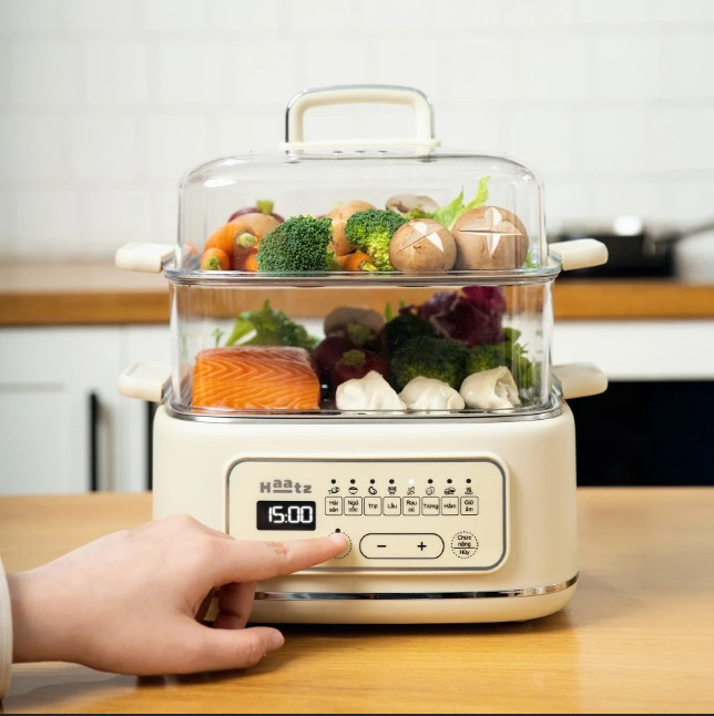 Haatz là một thương hiệu gia dụng uy tín tại Hàn Quốc, nhận được sự tin tưởng, đồng hành của hàng triệu người dùng tại xứ sở kim chi. Có mặt tại Việt Nam từ năm 2024, Thương hiệu đồ gia dụng Haatz luôn mong muốn mang đến cho người tiêu dùng những trải nghiệm tốt nhất khi sử dụng mỗi sản phẩm, hướng tới sự hài lòng và an tâm của khách hàng Việt MÔ TẢ SẢN PHẨM NỒI HẤP 2 TẦNG HAATZ đa năng là sự lựa chọn hoàn hảo cho gia đình bạn. Với thiết kế hiện đại, chất liệu cao cấp và công nghệ tiên tiến, sản phẩm này không chỉ giúp bạn nấu ăn nhanh chóng mà còn giữ được hương vị và dinh dưỡng của thực phẩm. ĐẶC ĐIỂM NỔI BẬT Thiết Kế 2Tầng Tiện Lợi: Nồi hấp 3 tầng giúp bạn nấu nhiều món ăn cùng một lúc, tiết kiệm thời gian và năng lượng. Chất Liệu Cao Cấp: Nồi được làm từ chất liệu inox cao cấp, an toàn cho sức khỏe, bền đẹp và dễ vệ sinh. Công Suất Mạnh Mẽ: Với công suất mạnh mẽ, nồi hấp nhanh chóng đạt đến nhiệt độ cần thiết, đảm bảo thực phẩm chín đều và giữ nguyên hương vị tự nhiên. Dễ Dàng Sử Dụng Nồi có bảng điều khiển dễ hiểu, cho phép bạn điều chỉnh thời gian và nhiệt độ một cách chính xác, sử dụng màn hình cảm ứng tiện lợi Thiết Kế Thông Minh: Nắp kính trong suốt giúp bạn dễ dàng quan sát quá trình nấu ăn mà không cần mở nắp, giữ được nhiệt độ và hơi nước. LỢI ÍCH KHI SỬ DỤNG Tiết Kiệm Thời Gian: Với nồi hấp 2 tầng, bạn có thể nấu nhiều món ăn cùng một lúc, giúp tiết kiệm thời gian nấu nướng. Giữ Nguyên Dinh Dưỡng:Nồi hấp giúp thực phẩm giữ được hương vị và dinh dưỡng tự nhiên, tốt cho sức khỏe. -Đa Dạng Món Ăn:Bạn có thể hấp rau, cá, thịt, bánh bao và nhiều món ăn khác một cách dễ dàng.