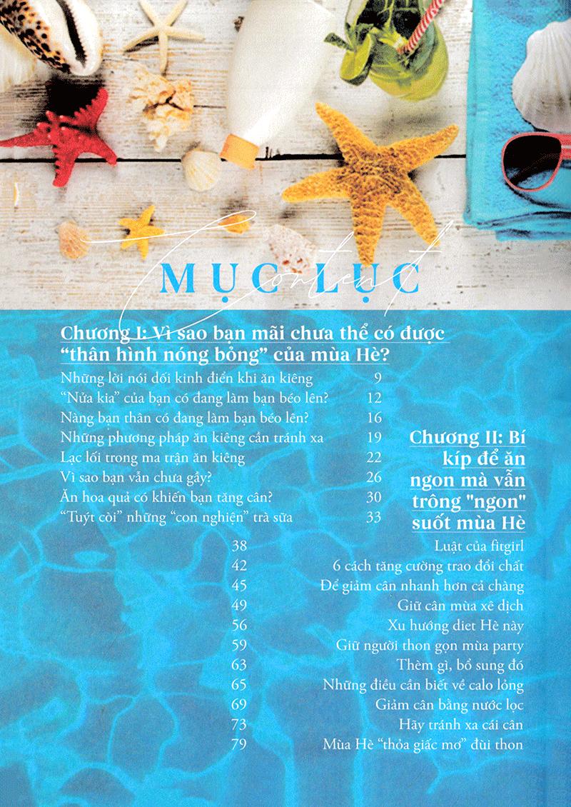 Bên cạnh những cách ăn kiêng khoa học và có tính khả thi cao như ăn kiêng kiểu Địa Trung Hải, paleo, pegan hay cân bằng kiềm, cuốn cẩm nang còn “bỏ nhỏ” cho nàng rất nhiều bí kíp tập tành, dựng style thời trang mùa Hè du lịch, chăm sóc da và trang điểm để có được phần ngoài thu hút nhất được chia sẻ bởi những hot beauty blogger và fashionista như Hana Giang Anh, Daul Be hay Julia Đoàn.