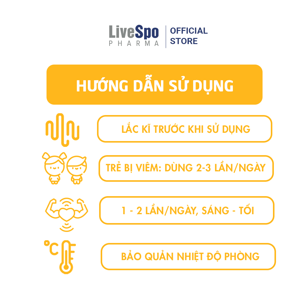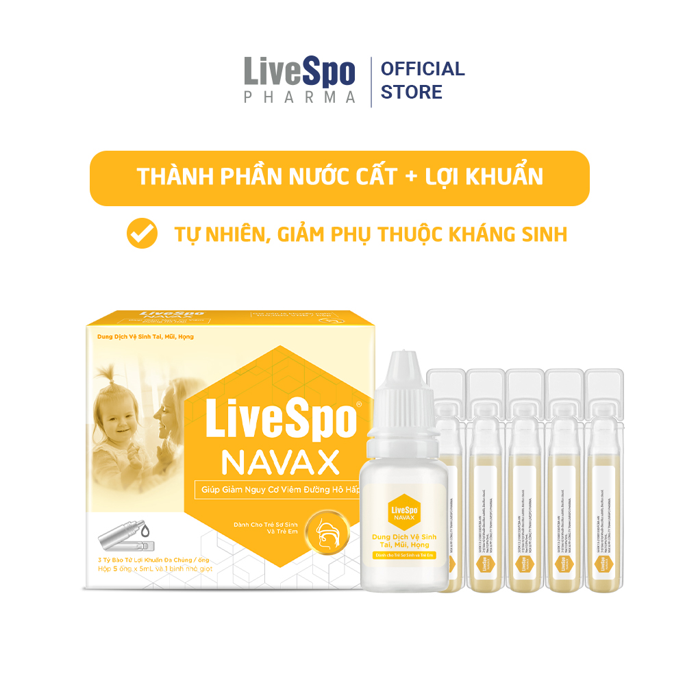 - Rút ngắn thời gian điều trị, hỗ trợ tăng tốc độ khỏi bệnh do vi rút RSV gây viêm đường hô hấp trên ở trẻ em. Thành phần: Mỗi ống LiveSpo Navax Kids có chứa 3 tỷ bào tử lợi khuẩn Bacillus clausii và Bacillus subtilis Nước muối sinh lý (0,9%). Công dụng: