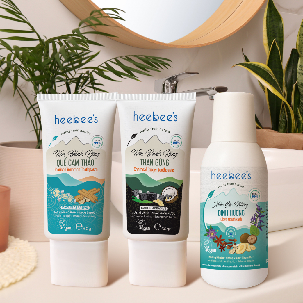 Nước Súc Miệng Thảo Dược Thuần Chay Chiết Xuất Đinh Hương Sạch khuẩn, Thơm Mát 150ml ĐIỂM NỔI BẬT Với 99,4% thành phần thiên nhiên, kết hợp 8 VỊ DƯỢC LIỆU QUÝ cùng CÔNG NGHỆ KHOÁNG ION ĐỘC QUYỀN, nước Súc Miệng Thảo Dược Thuần Chay Đinh Hương mang đến khả năng làm sạch sâu, kháng khuẩn và nuôi dưỡng răng nướu nhạy cảm mỗi ngày. Từng dòng nước mịn len lỏi vào kẽ răng, giúp cân bằng pH, giữ ẩm khoang miệng và để lại dư vị thảo mộc đa tầng: dịu ngọt – ấm nồng – mát lành. An toàn cho cả trẻ nhỏ, mẹ bầu và người tiểu đường – lựa chọn lý tưởng cho những ai tìm về sự thuần khiết, lành tính từ thiên nhiên. THÀNH PHẦN CHÍNH ĐIỀU GÌ KHIẾN NƯỚC SÚC MIỆNG THẢO DƯỢC ĐINH HƯƠNG HEEBEE'S KHÁC BIỆT? CAM KẾT SẢN PHẨM CÔNG DỤNG ‣ Làm Sạch Sâu, Loại Bỏ Mảng Bám ‣ Phục Hồi Và Bảo Vệ Nướu ‣ Khử Mùi Hôi Miệng, Giúp Hơi Thở Thơm Mát Dài Lâu ‣ Sạch Khuẩn, Giảm Vi.ê..m., Làm Sạch Vùng Họng ‣ Bảo Vệ Men Răng, Ngăn Ngừa Ố Vàng ĐỐI TƯỢNG SỬ DỤNG ‣ Phù hợp sử dụng cho mọi đối tượng và lứa tuổi ‣ Phù hợp sử dụng cho thai phụ trước, trong và sau sinh ‣ Lý tưởng với người có răng nướu nhạy cảm, ê buốt, sâu răng; các vấn đề nhiệt miệng, v.iê..m. họng, viê..m. họng hạt ‣ Đặc biệt sử dụng với các tình trạng hôi miệng, mùi hôi thực phẩm (mắm, rượu, bia,..) CÁCH SỬ DỤNG ‣ Lắc nhẹ chai trước khi dùng. ‣ Dùng mỗi ngày sau khi đánh răng, sau ăn hoặc khi cần làm sạch miệng – họng. ‣ Có thể súc trực tiếp hoặc pha loãng: • Người lớn: 5–10ml với nước (tỉ lệ 1:3 hoặc 1:4) • Trẻ từ 6 tuổi: 3–5ml với nước • Ngậm 1–3 phút, khò nhẹ, rồi nhổ bỏ ‣ Với viêm nướu, nhiệt miệng, viêm họng: dùng 10–15ml nguyên chất, súc kỹ và khò nhẹ để làm sạch họng. Có thể súc lại bằng nước. Lưu ý: ‣ Không được nuốt. Trẻ em cần người lớn giám sát khi dùng. ‣ Dùng đều đặn mỗi ngày để bảo vệ và khử mùi hôi miệng. HƯỚNG DẪN BẢO QUẢN ‣ Bảo quản nơi khô ráo, thoáng mát, tránh ánh nắng trực tiếp và nhiệt độ cao ‣ Đậy nắp kín sau khi sử dụng THÀNH PHẦN CHI TIẾT Water (Ionzied Mineral), Glycyrrhiza Uralensis Root Extract (Chiết xuất Cam Thảo), Sorbitol, Ocimum Tenuiflorum Extract (Chiết xuất Hương Nhu), Eugenia Caryophyllus Seed Extract (Chiết xuất Đinh Hương), Siraitia Grosvenorii Fruit Extract (Chiết xuất La Hán Quả), Propanediol, Isosorbide, Glycerin, PEG-40 Hydrogenated Castor Oil, Zingiber Officinale Root Extract (Chiết xuất Gừng), Illicium Verum Fruit Extract (Chiết xuất Đại Hồi), Passiflora Laurifolia Flower Extract (Chiết xuất Lạc Tiên), Piper Betle Leaf Extract (Chiết xuất Lá Trầu Không), Sodium Chloride (0.9%), Panthenol, Sodium Benzoate, Caprylic/Capric Triglyceride, Glycolipids, Potassium Sorbate, Mentha Piperita Oil (Tinh dầu Bạc Hà), Citric Acid.