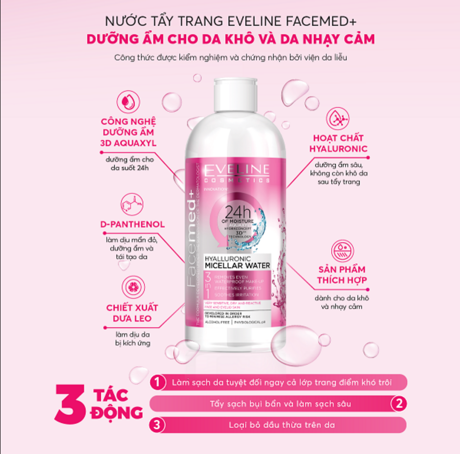 Công thức đột phá giúp tẩy đi lớp trang điểm không trôi và nhẹ nhàng lấy đi các chất cặn bã, lượng dầu nhờn bám trên da. Hoạt chất Hyaluronic, D-Panthenol và chiết xuất dưa leo nhanh chóng làm dịu vùng da bị kích ứng, giúp dưỡng ẩm sâu, loại bỏ hoàn toàn nỗi lo khô da sau tẩy trang. Với độ pH trung tính, không chứa cồn và paraben, nước tẩy trang Facemed+ an toàn cho cả làn da nhạy cảm, giúp phục hồi làn da sạch mịn như lụa.