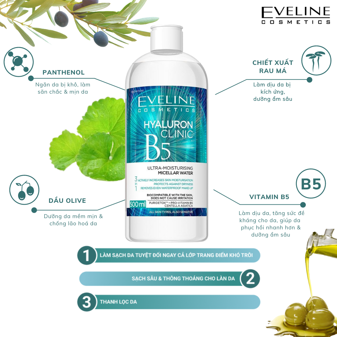 Nước Tẩy Trang Eveline Hyaluron Clinic B5 Và Tinh Chất Rau Má Làm Dịu, Dưỡng Ẩm Và Phục Hồi Da 500ML Nước tẩy trang Eveline Hyaluronic Clinic dưỡng ẩm 3 trong 1
