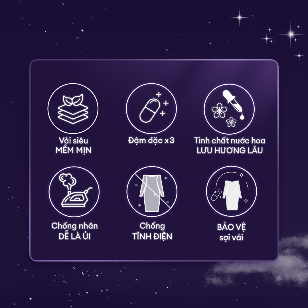 Làm mềm và dưỡng vải siêu mềm mịn, chống nhăn và giúp dễ là ủi;