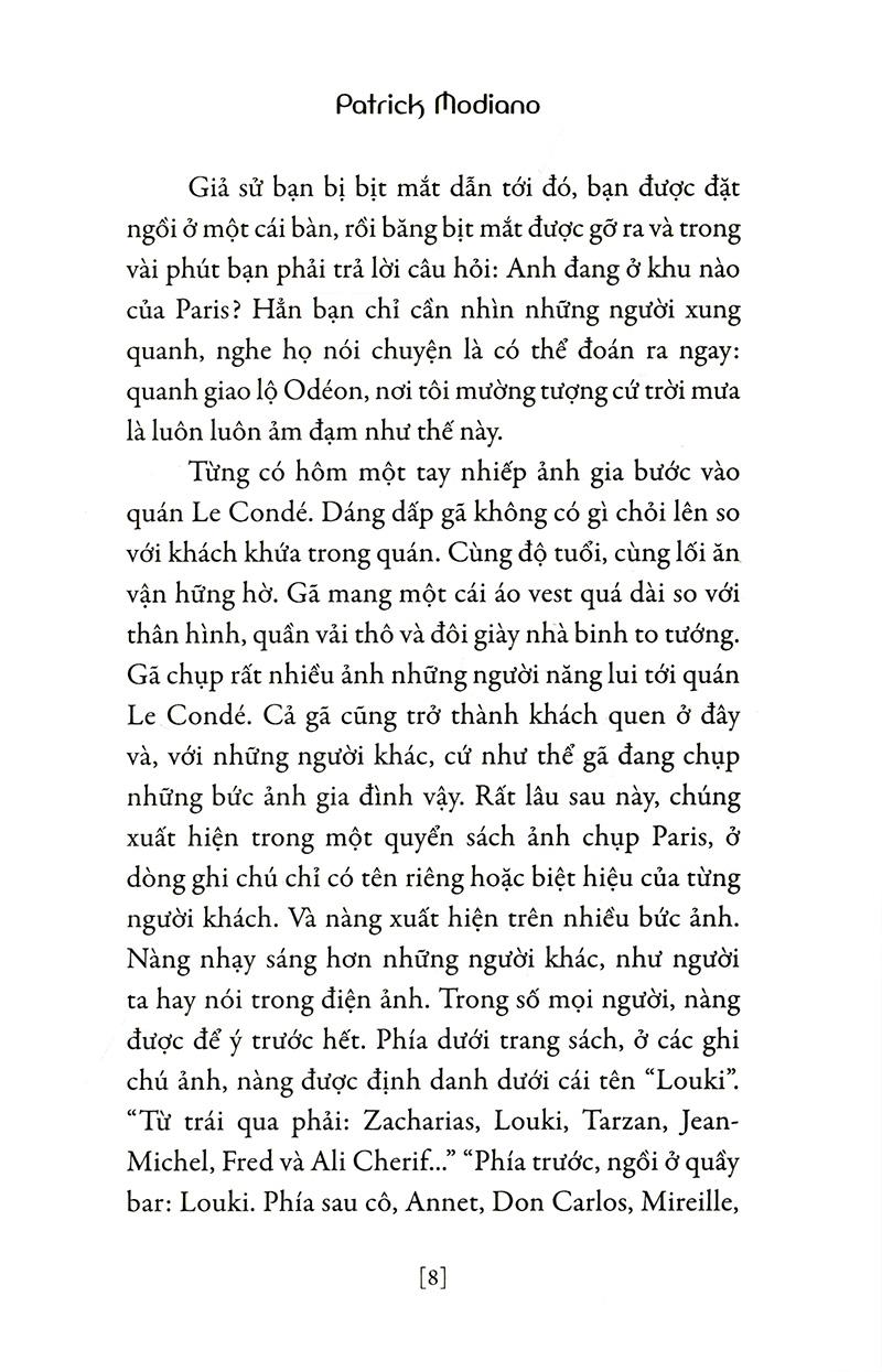 Hiếm tác giả nào khai thác di sản triết học của Guy Debord mềm mại như thế. Patrick Modiano đã biến lý tưởng "trôi dạt" của triết gia độc đáo ấy trở thành một tác phẩm cuốn hút, đặt những người có thật vào vòng hư ảo và đưa nhân vật hư ảo đến bến bờ thực tại theo một đường lối văn chương ảo diệu, ở quán cà phê của tuổi trẻ đã qua.