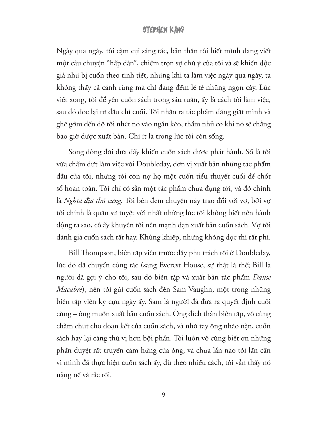 Pet Sematary - Nghĩa Địa Thú Cưng   Khi Tiến sĩ Louis Creed nhận một công việc mới và đã cùng cả gia đình chuyển đến thị trấn nông thôn bình dị ở Ludlow, Maine. Ngay cả khi đã yên ấm trong căn nhà mới, Louis vẫn không thể tin nổi khởi đầu tuyệt vời này đã trở thành sự thật. Bất chấp sự yên bình của vùng quê Ludlow, nơi đây vẫn tiềm ẩn một mối nguy đang rình rập. Những chiếc xe tải lao vun vút trên con đường phía bên ngoài ngôi nhà cổ xinh đẹp của Creed vì một điều…   Khu nghĩa địa tạm bợ trong khu rừng gần đó, nơi nhiều thế hệ trẻ em đã chôn cất những con thú cưng yêu quý của chúng.   Ngay sau đó, Louis liên tiếp nhận được những lời cảnh báo từ cả thực tế lẫn từ sâu thẳm trong cơn ác mộng của anh rằng anh đừng mạo hiểm vượt ra ngoài ranh giới của nghĩa địa nhỏ này, cũng là vị trí của một khu chôn cất khác với những lời hứa đầy hấp dẫn và ma mị.   Louis đã bước chân vào hành trình khám phá ra sự thật bị che giấu ấy – một sự thật còn đáng sợ hơn chính cái chết.   Về tác giả:   Stephen King là tác giả của hơn 60 cuốn sách, tất cả đều là những cuốn sách bán chạy nhất trên toàn thế giới. Các tác phẩm gần đây của ông bao gồm Fairy Tale, Billy Summers, If It Bleeds, The Institute, Elevation, The Outsider, Sleeping Beauties (viết chung với con trai Owen King), và bộ ba phim Bill Hodges: End of Watch, Finders Keepers và Mr. Mercedes (chiến thắng Giải thưởng Edgar cho Tiểu thuyết hay nhất). Cuốn tiểu thuyết 22/11/63 được The New York Times Book Review bình chọn là cuốn sách hay nhất của năm 2011 và giành được Giải thưởng Sách của Thời báo Los Angeles cho thể loại Bí ẩn / Kinh dị. Các tác phẩm The Dark Tower, It, Pet Sematary và Doctor Sleep của ông đã được chuyển thể thành phim, với It hiện là phim kinh dị có doanh thu cao nhất mọi thời đại. Ông là người đã nhận được Giải thưởng Thành tựu trọn đời của Hiệp hội Nhà xuất bản Âm thanh năm 2020, Giải thưởng Dịch vụ Văn học PEN Hoa Kỳ năm 2018, Huy chương Nghệ thuật Quốc gia năm 2014 và Huy chương của Quỹ Sách Quốc gia năm 2003 cho những đóng góp xuất sắc cho nền văn học Hoa Kỳ. Anh sống ở Bangor, Maine, với vợ, tiểu thuyết gia Tabitha King.   Đánh giá về cuốn sách   Hai lần được chuyển thể thành phim (1989 và 2019). Pet Sematary bản 1989 được đánh giá là một trong những phim kinh dị "cult culture" (những bộ phim không được giới phê bình đánh giá cao, không có doanh thu lớn, không được công chúng yêu thích, nhưng được một nhóm nhỏ yêu thích cuồng nhiệt). Nhận được tận 6,6 điểm trên IMDb, có số lượng DVD bán ra rất chạy, và được nhắc đến nhiều trong các bộ phim khác. Đây là một trong những tiểu thuyết kinh dị xuất sắc và mang tính biểu tượng nhất của Stephen King.   “Hoang dại, rùng rợn và gây bấn loạn” là những tính từ mà tờ The Washington Post Book World đã dùng để miêu tả về cuốn sách bán chạy số 1 theo bình chọn của New York Times này.   Một thước phim hành động nghẹt thở! Một trong những tiểu thuyết kinh dị xuất sắc và mang tính biểu tượng nhất của Stephen King.   “Cuốn tiểu thuyết đáng sợ nhất của Stephen King.” —Publishers Weekly   “Một tác phẩm gây choáng vá King đã khiến chúng ta phải tin những điều không tưởng.” —Detroit News   “Day dứt, cuộn trào, thuyết phục và đầy ấn tượng!” —Pittsburgh Press