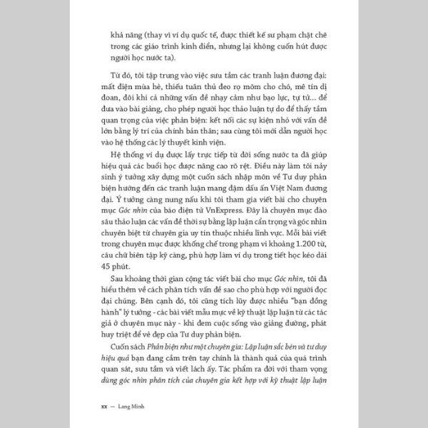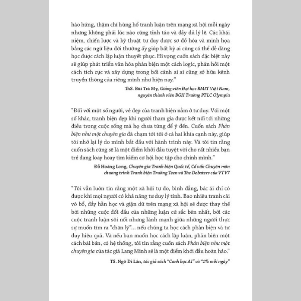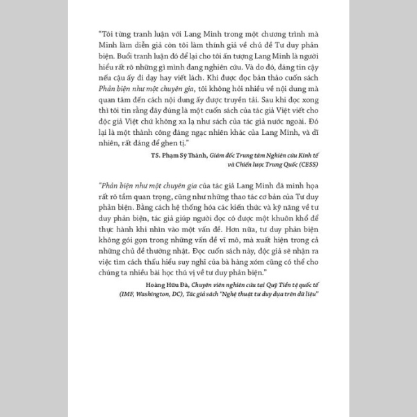 "Phản biện như một chuyên gia: Lập luận sắc bén và tư duy hiệu quả" là tác phẩm ra đời với tham vọng dùng góc nhìn phân tích của chuyên gia kết hợp với kỹ thuật lập luận ngắn gọn mà sắc nét của báo chí để dẫn dắt bạn đọc Việt Nam làm quen với tư duy phản biện theo một cách sống động, đầy hơi thở cuộc sống. Bản thảo được tác giả Lang Minh xây dựng dựa trên kinh nghiệm nhiều năm giảng dạy kỹ năng tư duy phản biện và viết các bài nghị luận xã hội cho mục Góc nhìn của VNExpress, nội dung sách kết hợp kiến thức từ sách vở với các ví dụ từ bài viết của các chuyên gia trên nhiều lĩnh vực.