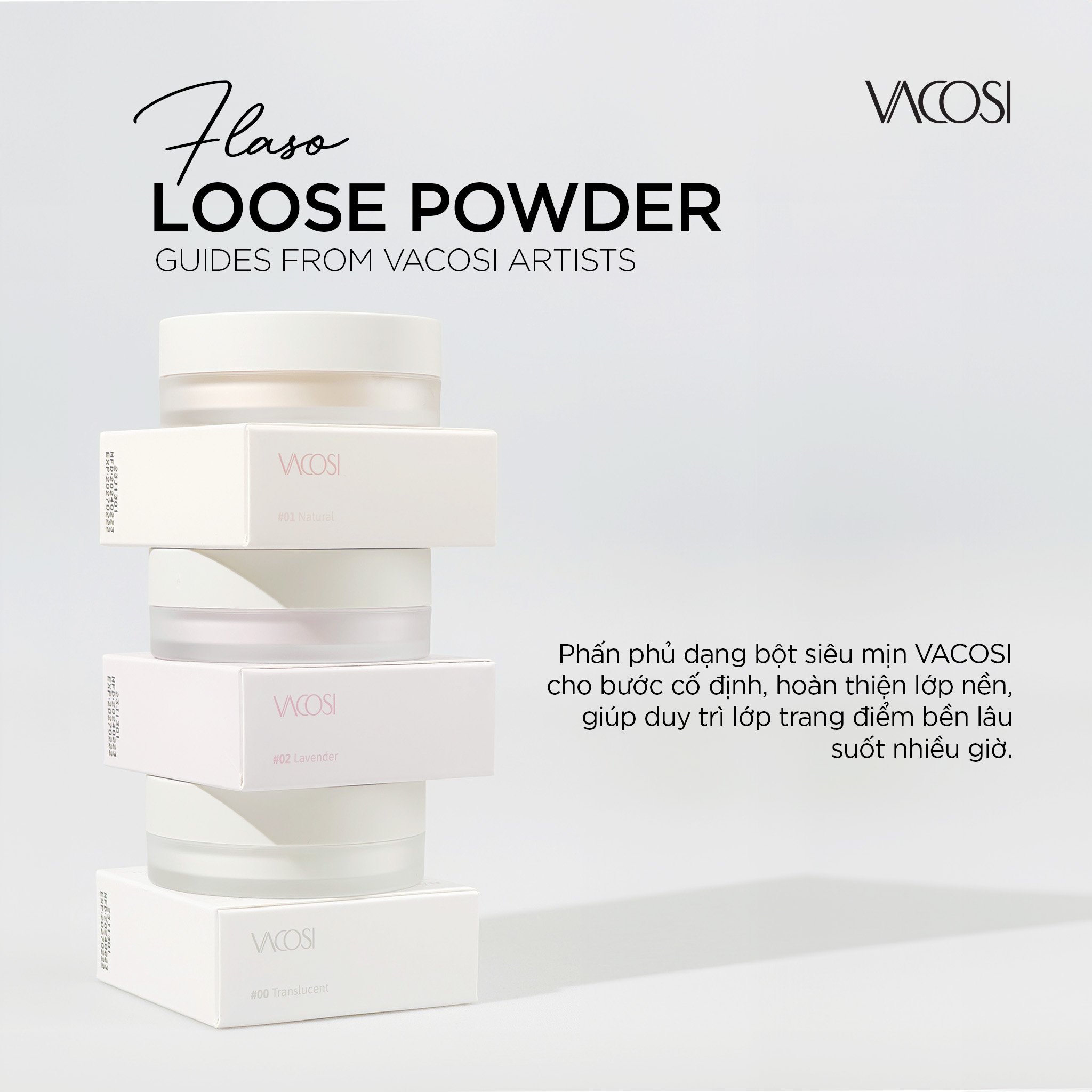 Flaso Loose Powder có 3 tone màu phù hợp với tone da và nhu cầu trang điểm khác nhau:
