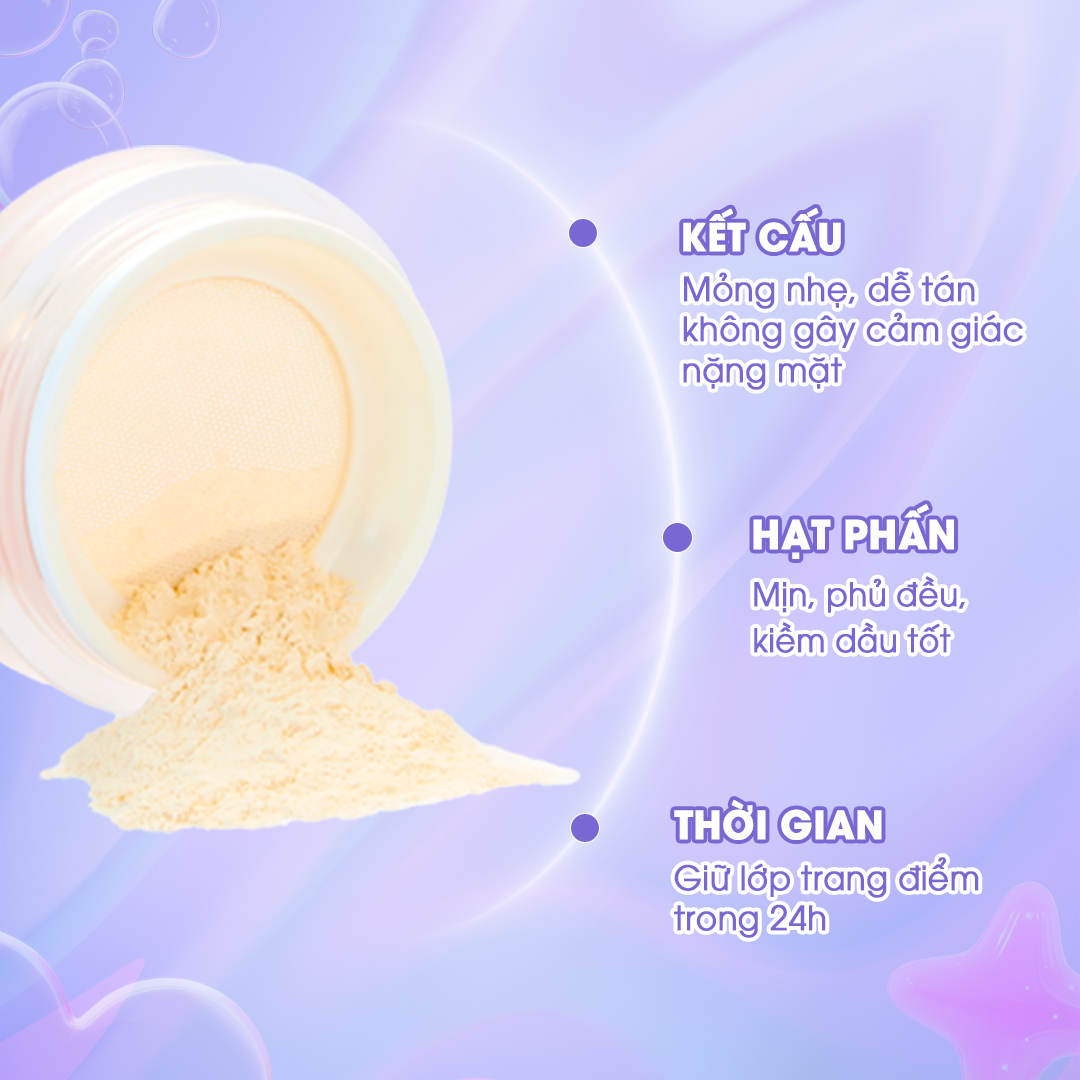 - Kiểm soát dầu nhờn: Thấm hút và kiểm soát dầu nhờn cực tốt, giúp lớp trang điểm không bị bóng dầu.