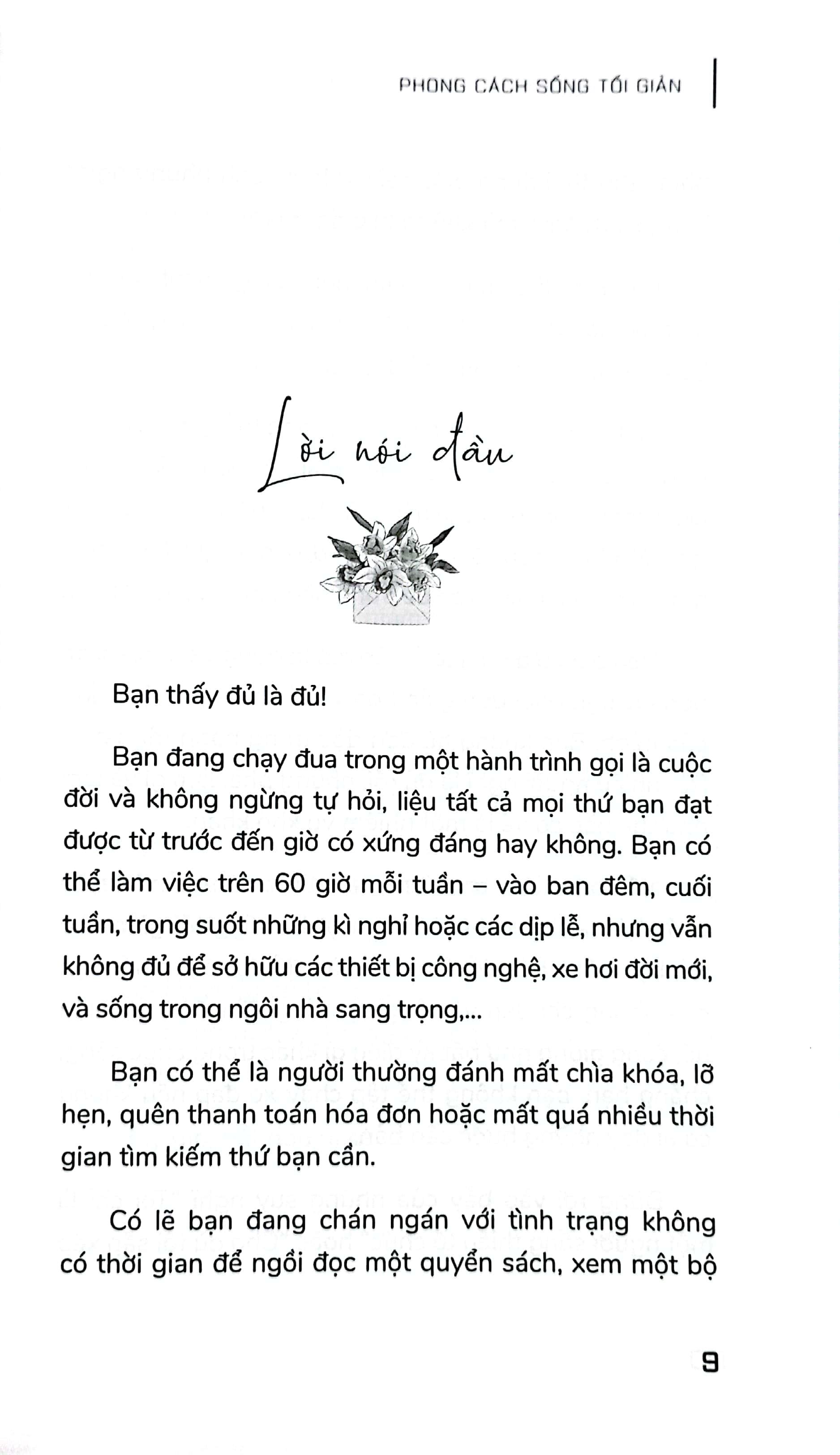 Phong Cách Sống Tối Giản Bạn quá choáng ngợp bởi quá nhiều thứ xung quanh không gian sống? Bạn chán việc cứ mãi tìm kiếm chìa khóa, khiến bỏ lỡ các cuộc hẹn và thường xuyên trễ giờ làm? Bạn mong muốn có một không gian thoáng đãng, thoải mái, dễ chịu, nhưng không biết bắt đầu từ đâu? Nếu đã sẵn sàng và quyết định chọn lựa lối sống tối giản, bạn sẽ giảm bớt sự căng thẳng, có thêm nhiều thời gian làm những việc yêu thích, và sống một cuộc sống cân bằng, trọn vẹn hơn. Chỉ cần thực hiện theo các chỉ dẫn từ PHONG CÁCH SỐNG TỐI GIẢN, và cố gắng duy trì nó như một thói quen mỗi ngày, bạn sẽ thấy được niềm vui khi đạt được những thành quả.