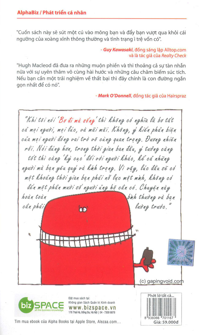 Nếu bạn đang cảm thấy chán nán hay tức tối vì những ý tưởng, những việc làm vô cùng sáng tạo, đang bị mọi người chê bai và xem thường, thì hãy đọc và làm theo Hugh Macleod, Phớt Lờ Tất Cả Và Bơ Đi Mà Sống. Quyển sách chứa đựng nguồn năng lượng tiếp thêm can đảm để đương đầu với mọi thử thách, khó khăn trước mắt, để chiến đấu tới cùng cho ước mơ.