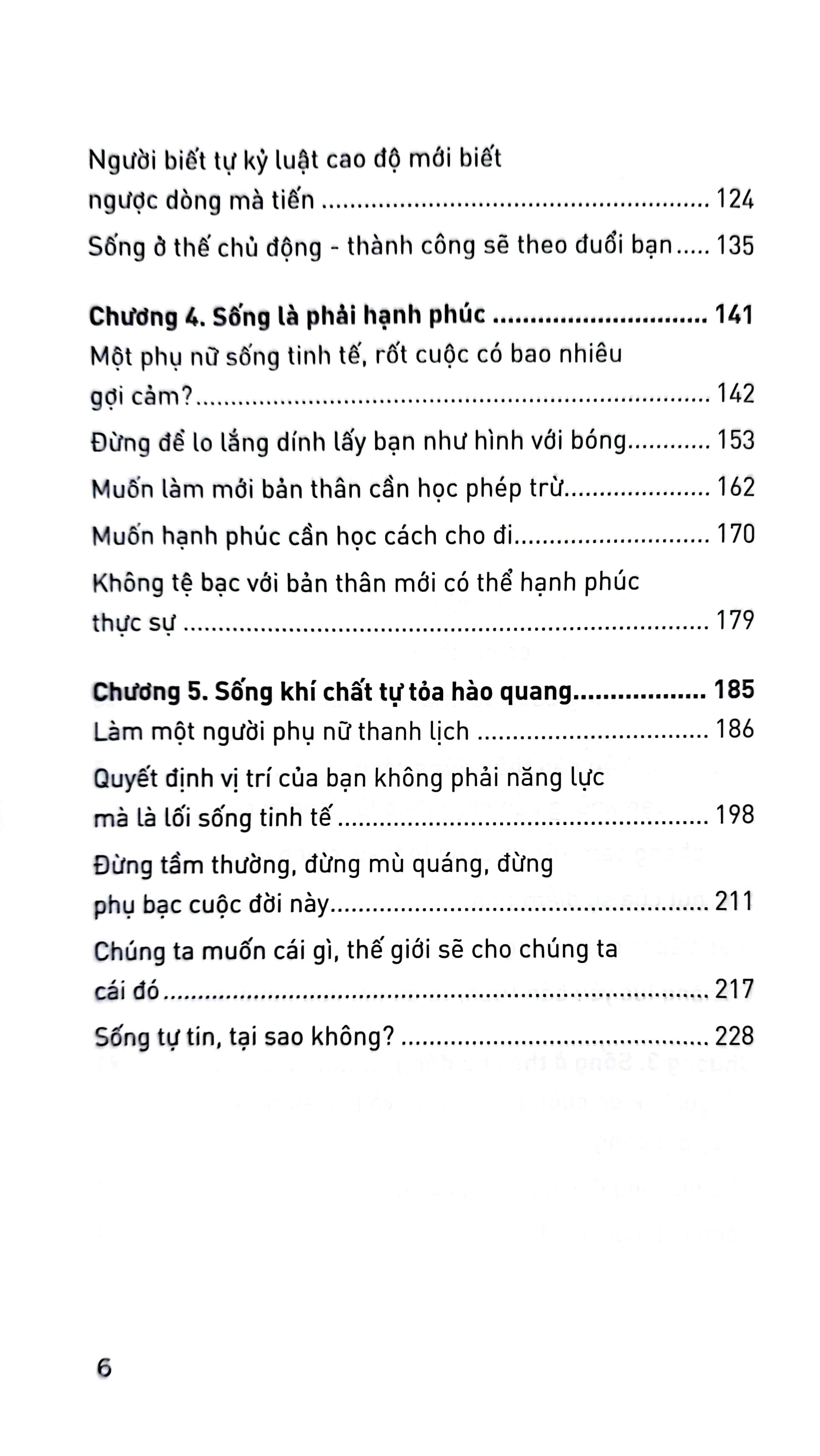 Phụ Nữ Khí Chất Sẽ Tự Có Hào Quang (Sbooks) GIỚI THIỆU SÁCH: Phụ nữ hiện đại có ngồi im chờ tình yêu? Phụ nữ hiện đại có cần một chỗ dựa dẫm? Phụ nữ hiện đại có đặt hạnh phúc của mình lên tay người khác? Không, dĩ nhiên là không! Phụ nữ hiện đại không ngại thể hiện sự quyến rũ của mình trong tính cách, sự thanh lịch, sự độc lập và hiểu biết sâu sắc. Phụ nữ khí chất sẽ tự có hào quang. Mọi thứ sẽ đến khi họ muốn, bởi vì hạnh phúc đều nằm trong tay họ. "Để tìm thấy chính mình trước tiên hãy tìm hiểu về chính mình." Người bạn thực sự tìm thấy là một trải nghiệm khai sáng. Bạn trở nên tự lập và làm mọi việc vì chính bản thân mình. Đó là một cảm giác khó diễn tả bằng lời nhưng khi bạn chưa biết mình là ai thì thật khó để bỏ qua. Tìm lại chính mình không phải là điều dễ dàng, nhưng nó đáng giá. Còn nếu bạn chưa biết vẻ đẹp của chính mình, hãy đọc cuốn sách này. Với những bài viết được chắt lọc từ kinh nghiệm cá nhân, và tham khảo nhiều tài liệu hữu ích, tác giả đã đưa ra các luận điểm giúp cho các bạn nữ dễ dàng hơn trên hành trình tỏa sáng, tự nắm lấy khí chất của bản thân, và đạt được hào quang đời mình. Phụ nữ, bạn sẵn sàng chưa?